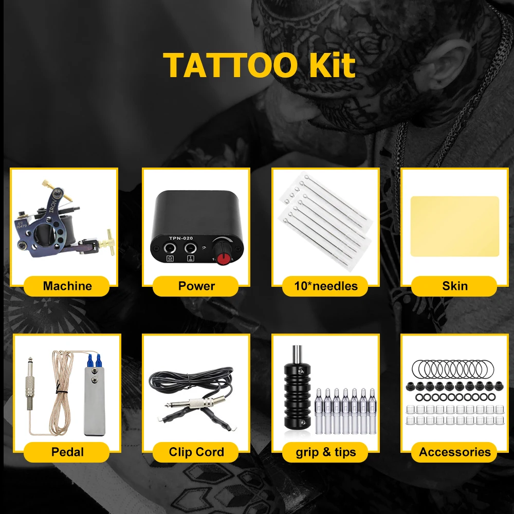 -Татуировочная машина 10 обмоток, изготовленная из высококачественного железа. Легкий и низкий уровень вибрации, может работать долгое время без усталости рук.-Можно использовать как с одной татуировкой. Подходит для всех видов ручек и игл.-Мини-Татуировка питания с педалью и зажимом шнура, обеспечивают быструю и точную активацию/регулировку напряжения.-316 иглы для татуировки из нержавеющей стали. Индивидуальная упаковка.-Изготовлены из алюминиевого сплава татуировки ручки, рифленая Нескользящая конструкция.-Стартовый набор татуировки включает в себя все принадлежности для татуировки. Полный набор для тату-это хороший выбор для ученика, начинающих и начинающих.