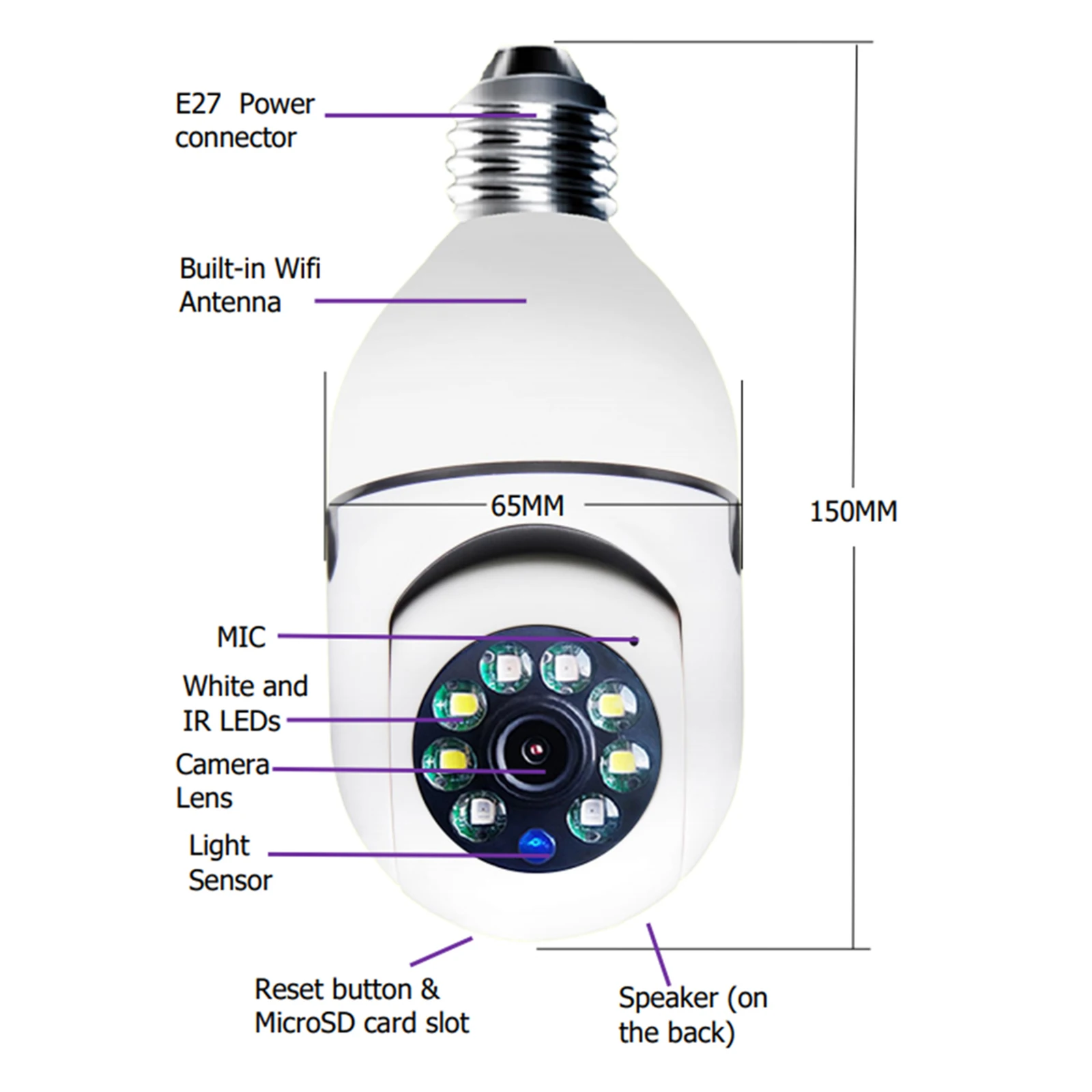 Камера также является лампочкой: камера оснащена 4 сильными светодиодами, чтобы обеспечить светильник в темноте. Когда камера обнаруживает, что кто-то проходит мимо, она будет светильник вверх и направлять в darknss.Три режима дневного и ночного видения: это красочное изображение в дневное время. Изображение черно-белое в ночное время. Изображение может быть красочным при включении белых светодиодов.