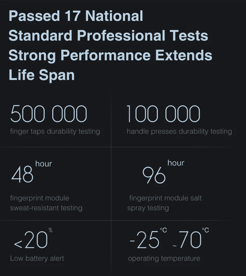Емкость пользователя: 50 отпечатков пальцев, 50 постоянных паролей, 25 устройств NFC, 25 временных паролей, 8 временных паролей