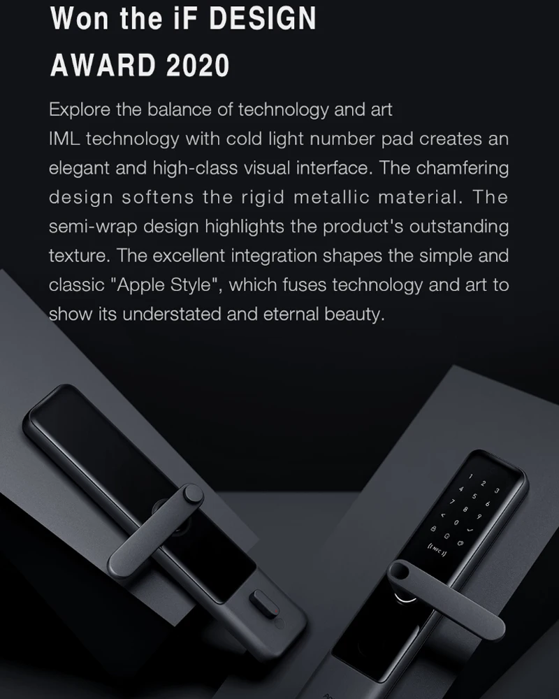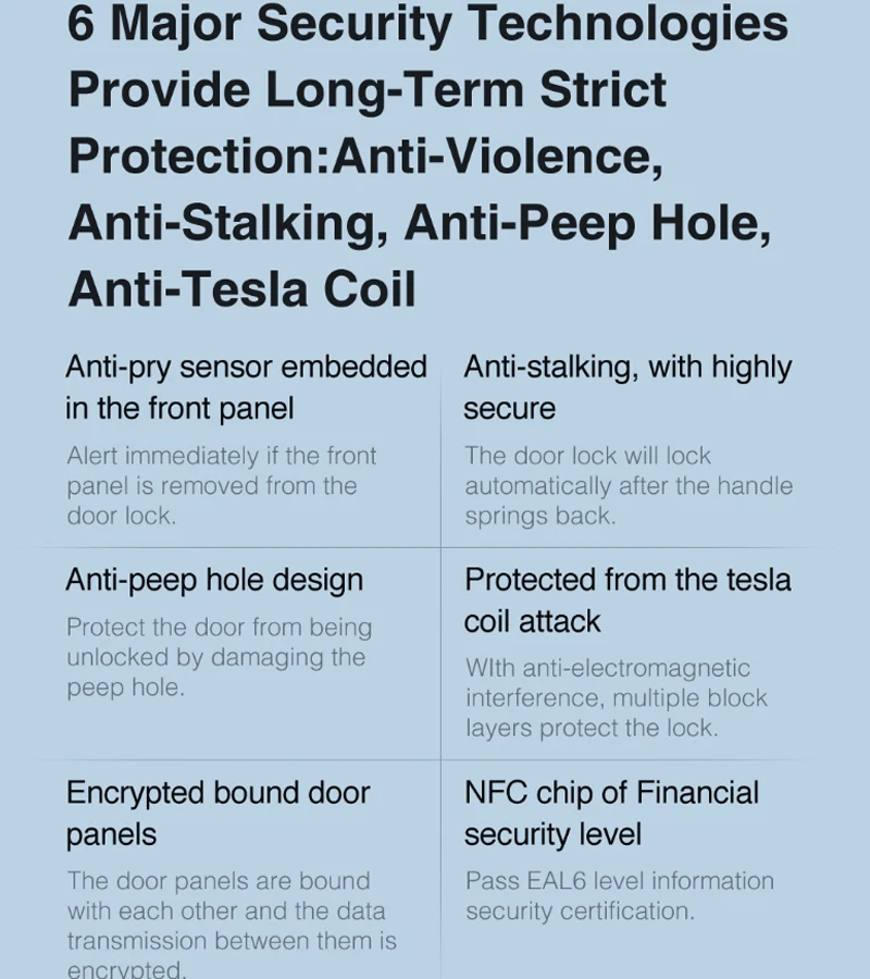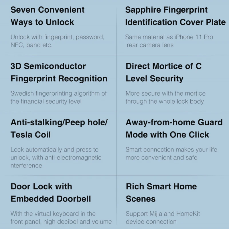 Разблокировка с отпечатком пальца, паролем, временным паролем, механическим ключом, NFC (поддерживается только Xiaomi phone, Mi band 4, последние часы), мобильный телефон Bluetooth, HomeKit.