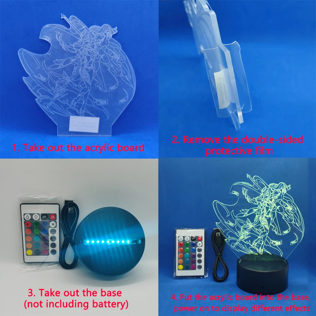 Основные характеристики:1) 7 цветов: красный, зеленый, синий, желтый, голубой, фиолетовый и белый2) Режим касания: пожалуйста, нажмите кнопку касания один раз, чтобы изменить один цвет, если Нажмите 8 раз, цвета будут изменены автоматически. Удерживайте переключатель вниз в течение 2 секунд, чтобы выключить.3) Режим дистанционного управления: пульт дистанционного управления с включением/выключением, 16 цветов, регулируемая яркость, режим вспышки, плавный режим.4) Источник питания: с помощью подключения USB интерфейса или с помощью 3 * AA батареи (не входят в комплект)Часто задаваемые вопросы:1. Какой размер акрилового листа и основания?Размер акриловой платы, вставленной в слот для карты, составляет 72 мм x 4 ммРазмер акриловой доски 18 мм x 16 мм (размер акриловой доски для разных символов может отличаться)Размер слота для карты основания 72 мм x 4 мм2. Какова ситуация с пузырьками или царапинами На полученном акриловом листе?Наш акриловый лист имеет защитную пленку с обеих сторон, а отдельные пузырьки или царапины на защитной пленке. Когда продукт используется, защитная пленка должна быть сначала удалена, так что она представляет полный и гладкий продукт с лучшим эффектом освещения. Это хорошо!3. О предоставлении случайных наклеекТак как каждый день много заказов, все представленные наклейки с персонажами являются случайными, поэтому мы не можем удовлетворить каждого клиента на 100%, я надеюсь, что клиенты поймут!4. Вопросы о послепродажном обслуживанииПосле того, как вы получите товар, если продукт поврежден из-за транспортировки или не будет использован самостоятельно, пожалуйста, свяжитесь со службой поддержки клиентов как можно скорее, мы поможем решить эту проблему, И не уклонится от ответственности!