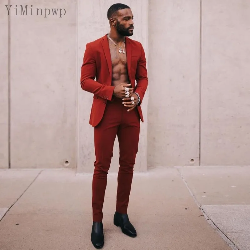 Красные мужские костюмы YiMinpwp, официальные костюмы для выпускного вечера с отложным воротником для мужчин, Свадебный Блейзер, смокинги, одежда для жениха, 2 предмета, пиджак + брюки