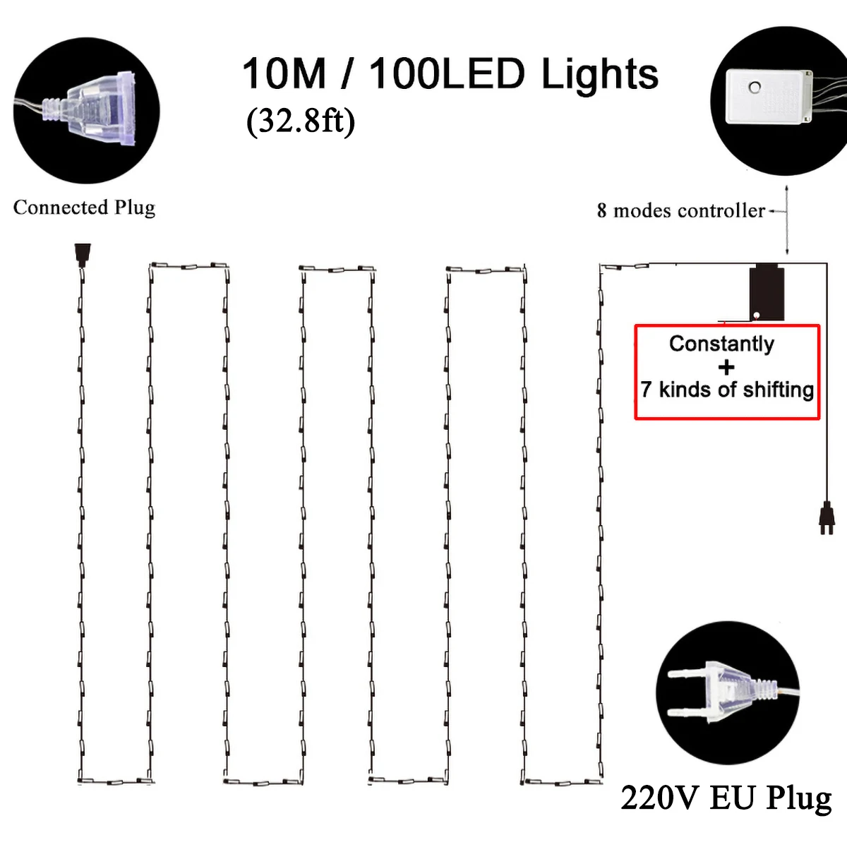 • [Яркость и тепло] наш светодиодный светильник на Рождество использует светодиодный светильник высокой яркости, каждый кристально чистый светодиодный светильник светится с углом обзора 360 градусов. Этот светильник очень теплый, мягкий и не ослепляющий, добавляя классический и очаровательный светильник к вашему рождественскому украшению• [8 режимов освещения с функцией памяти] 8 режимов для различных случаев и настроений, создавая уникальные атмосферы. Будь то романтическая годовщина, веселое Рождество или сюрпризы для ваших близких, эти сказочные гирлянды сделают трюк! Чтобы переключиться между режимами освещения the8, вам нужно всего лишь нажать кнопку на адаптере. Встроенный чип памяти сохраняет последний режим настройки, нет необходимости перезагружать режим каждый день• [Широко используется] 32,8 feets длинный (10 метров) светильник рождественской елки с 100 светодиодными лампами идеально подходит для использования в помещении и на открытом воздухе. Прозрачная проволока может скрывать внутри гирлянды, рождественскую елку и многое другое. Он также может сочетаться с любым фоном, очень подходит для комнаты, стены, сада, крыльца или добавления сверкающего свечения в ваш патио или балкон, что делает каждый уголок новым.• [Водонепроницаемость IP44] Наши водонепроницаемые рождественские гирлянды прошли сертификацию IP44. Все мини-светодиодный лампы-это светодиодный светильник fil с клейкими Слоями Горячего Расплава, защита от замерзания и окисления обеспечит более длительный срок службы. Идеально подходит для использования на открытом воздухе без повреждений, включая сильный дождь и снег. Но обратите внимание, что адаптер nad должен быть защищен от водыОбратите внимание:1. Если вы используете их на открытом воздухе, оберните вилку и адаптер в полиэтиленовый пакет, чтобы предотвратить попадание воды. Огни и шнуры водонепроницаемы, но они не должны замачиваться в воде.2. Фактическая длина может быть меньше, чем 32,8 футов (10 метров), но не менее 31,1 футов (9,5 метров).