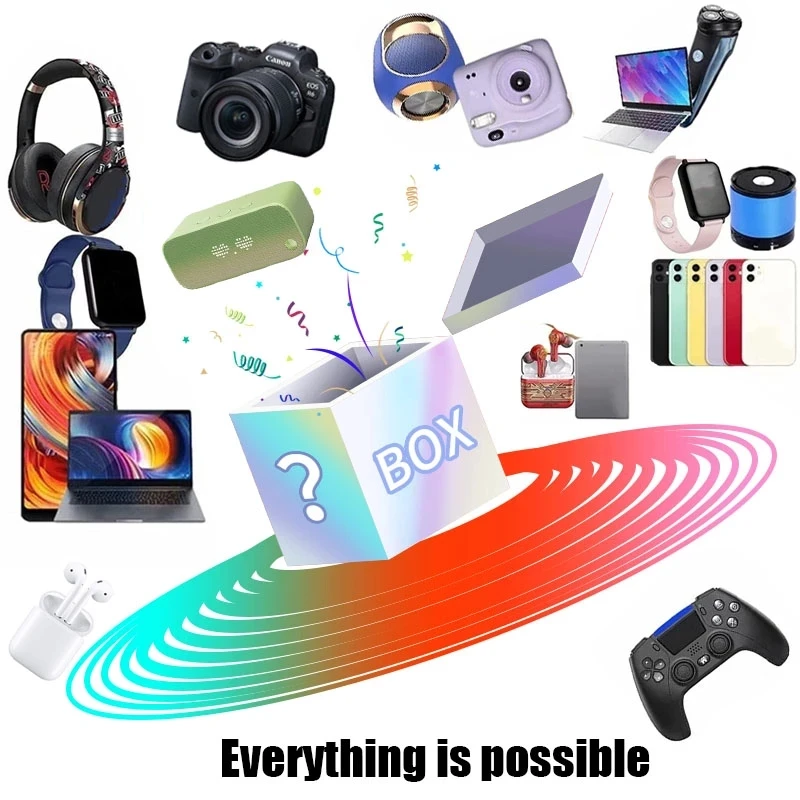 Электронная коробка Lucky Mystery Box, есть возможность открыть: такие как дроны, умные часы, геймпады, цифровые фотоаппараты и многое другое.