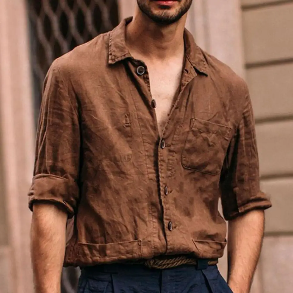 Стильная однотонная рубашка с отложным воротником, с несколькими карманами, однобортная рубашка с длинным рукавом, легко стирается, для повседневной носки, размера плюс