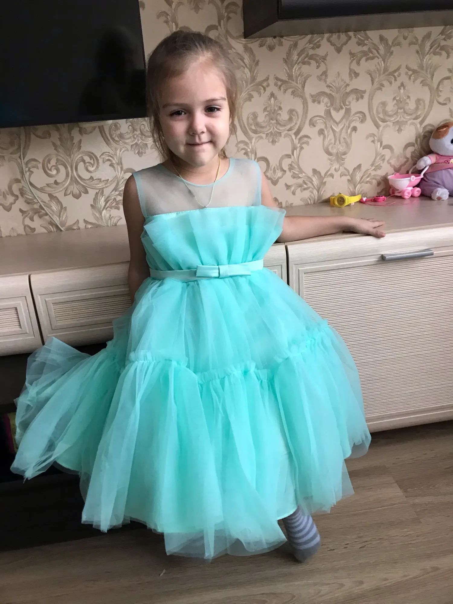 Отличное платье. Размер по таблице совпадает, платье не маломерит. Дочка довольна. Внутри на груди хлопковая подкладка. Бант на спине отстёгивается.