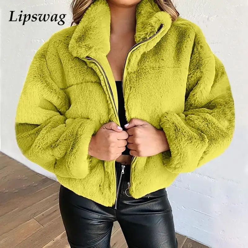 Повседневные теплые мягкие куртки из искусственного меха, элегантные однотонные шикарные пушистые женские топы, пальто, модная женская верхняя одежда на молнии с длинным рукавом