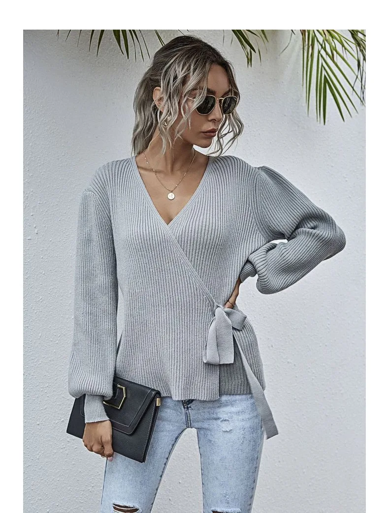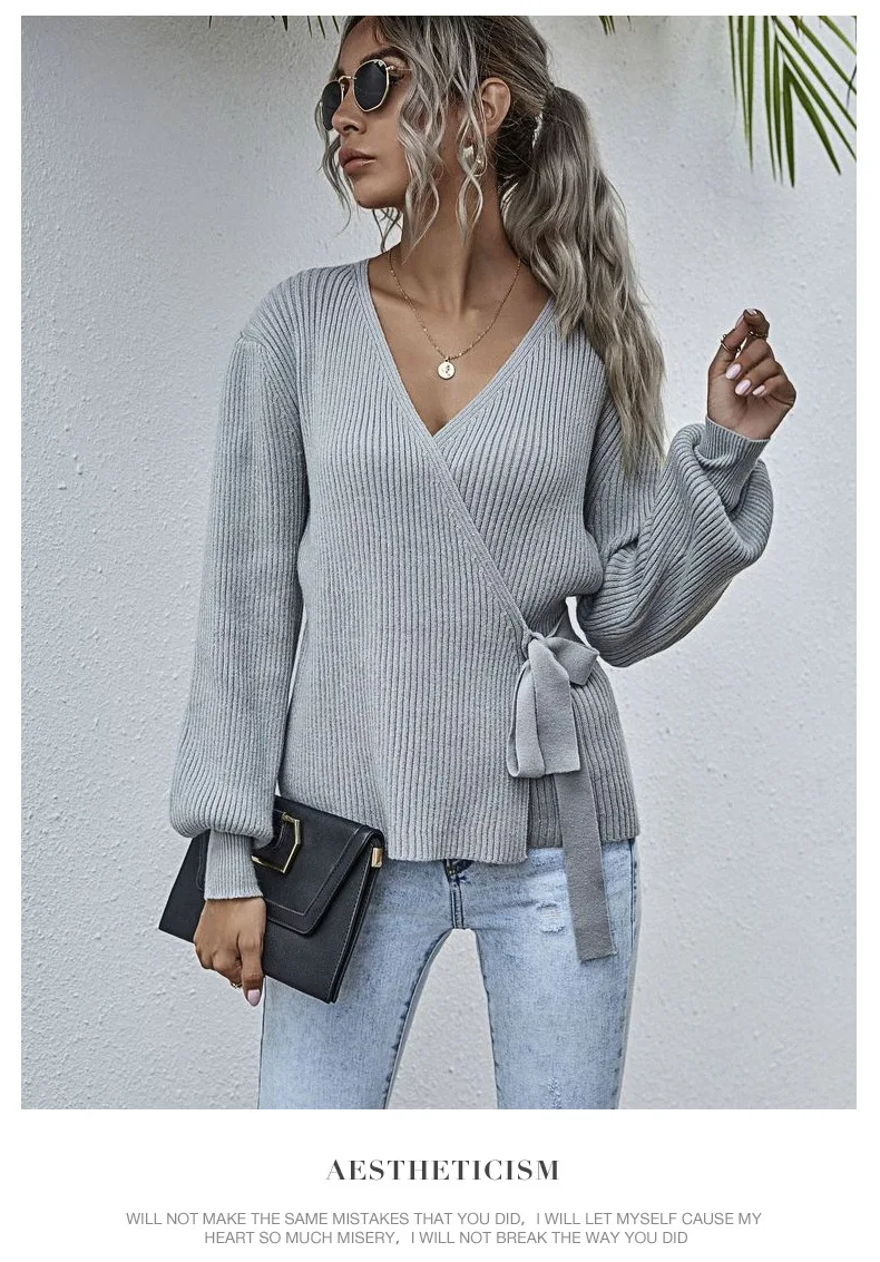 Женский трикотажный свитер с запахом на груди, с V-образным вырезом и завязкой на талии, Осень-зима 2021