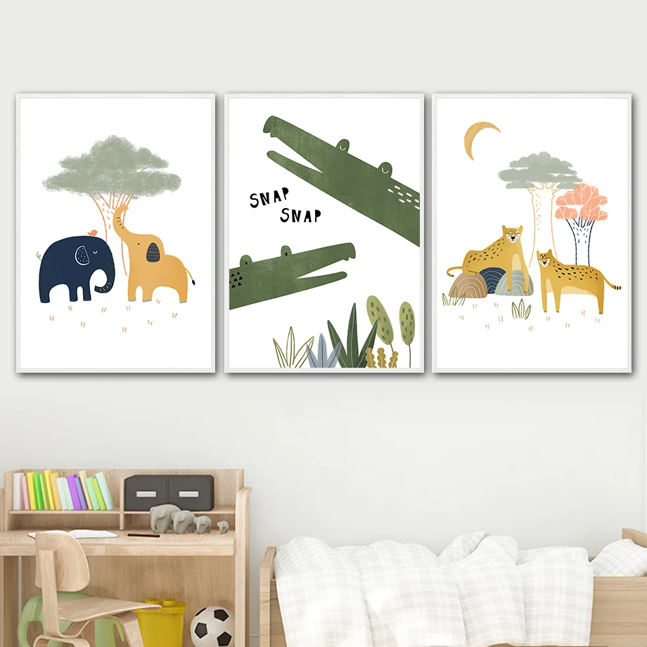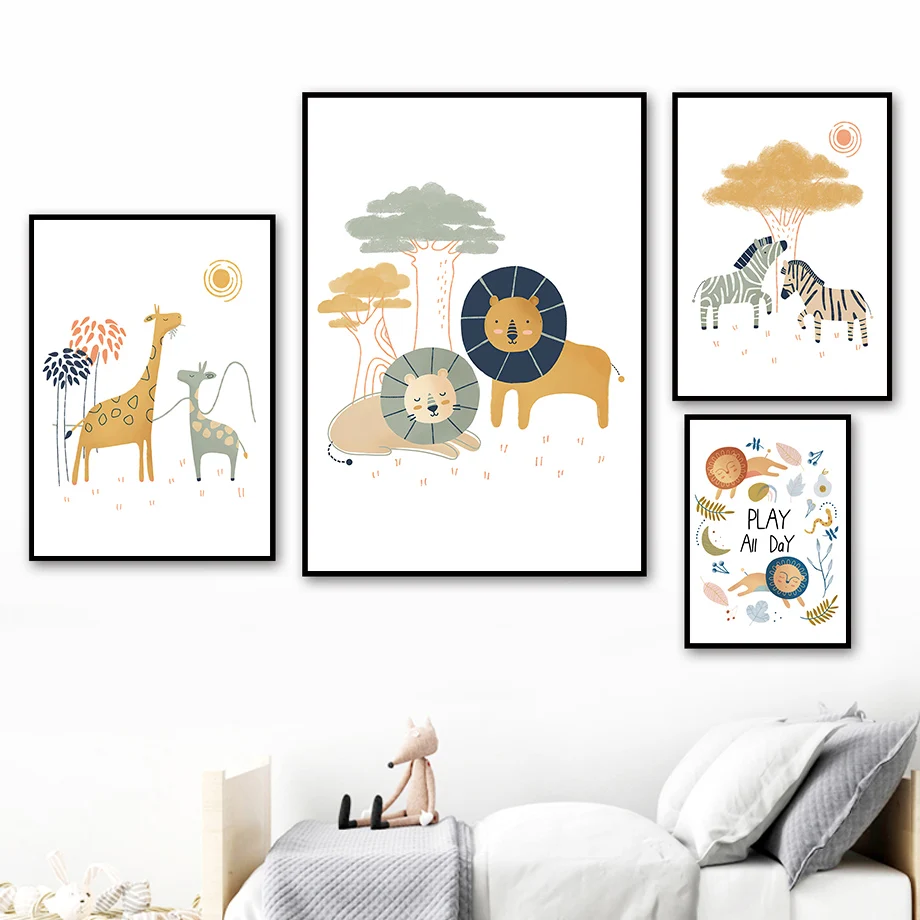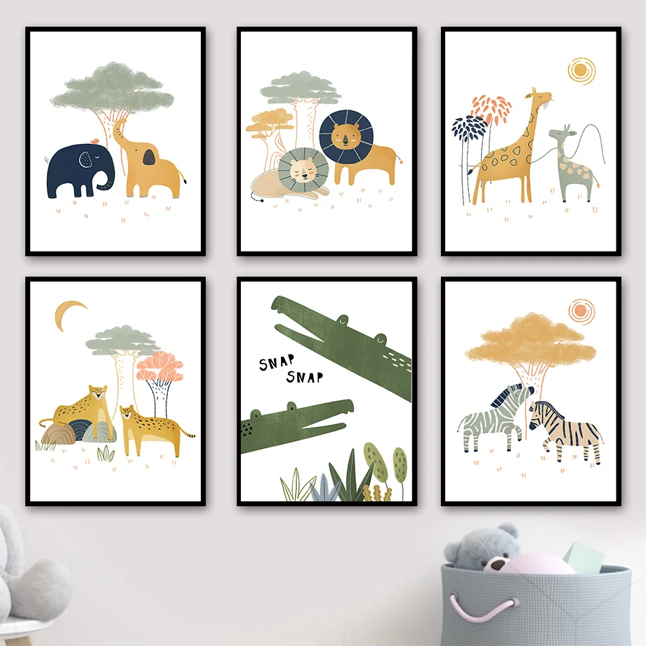 Настенная картина из мультфильмов джунгли животные Лев слон жираф Картина на холсте скандинавские плакаты и принты настенные картины для декора детской комнаты