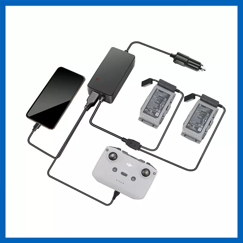 Характеристика:1.3в1 автомобильное зарядное устройство для DJI Mavic Air 2.2. Противоскользящий дизайн, более удобный в использовании.3. Быстрая зарядка, около 100 минут для полной зарядки 2 батарей одновременно.4. С usb-портом для контроллера, смартфона, планшета.