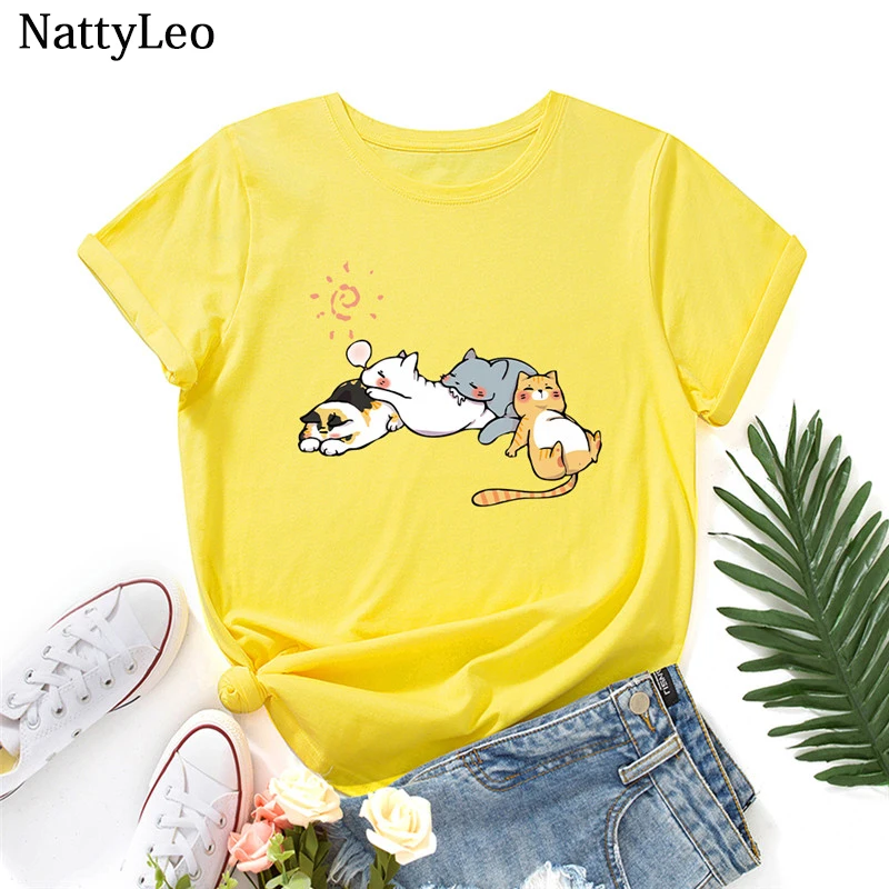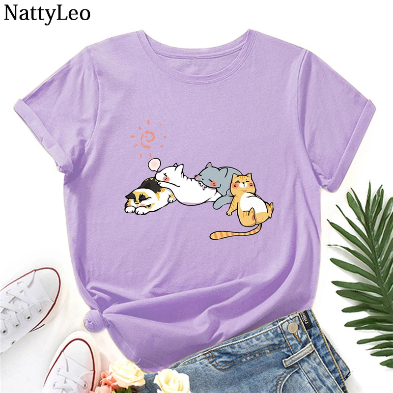 Фиолетовая Летняя женская рубашка с принтом в виде милых кошек, женская футболка из 100% хлопка, футболки с круглым вырезом и коротким рукавом, милые топы