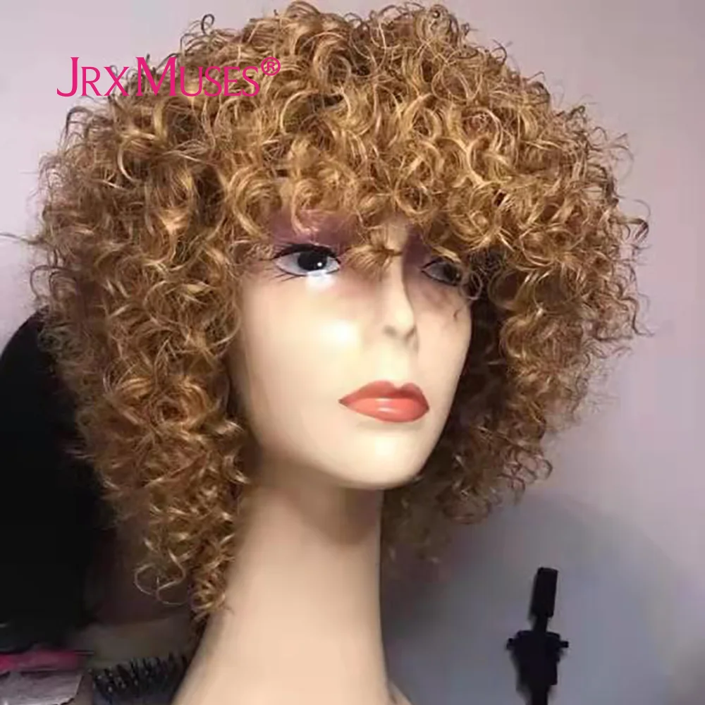 Медовый блонд, человеческие волосы, парики с челкой, малазийские кудрявые цветные, полный машинный дизайн, парики для женщин, кудрявые волосы Remy