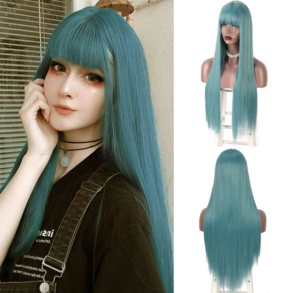 Длинные прямые Синие Серые синтетические парики с челкой henmargu, ...