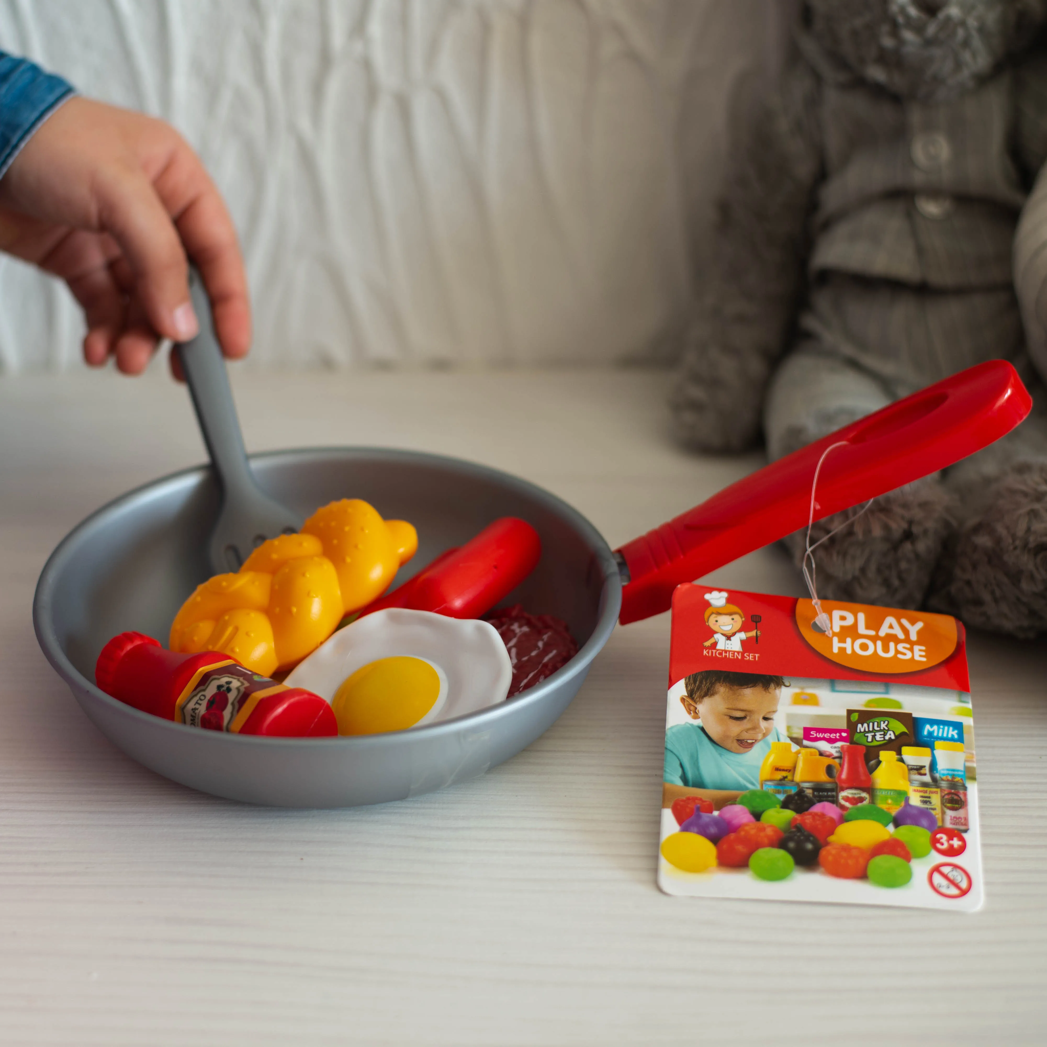-Имитация сковороды с едой. Стейк, овощи, омлеты, сосиски и кетчуп. -Моделирование, яркие цвета. -Удовлетворите желание вашего ребенка подражать взрослым.
