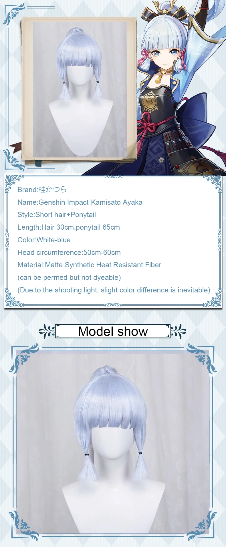 Игра Genshin Impact Kamisato Ayaka косплей парик 65 см белый синий конский хвост волосы