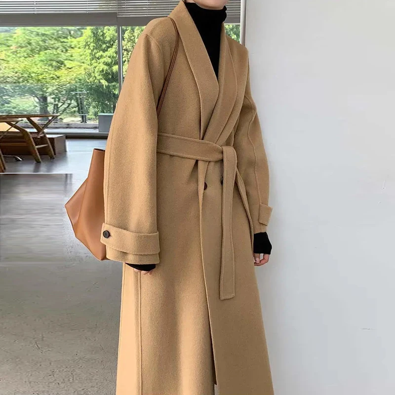 Женское шерстяное пальто Herstory, однотонное двубортное пальто с поясом, офисное пальто, Корейская уличная одежда для зимы