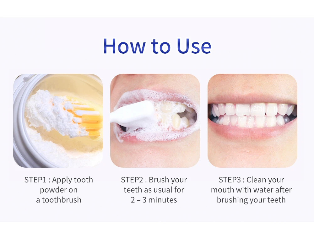 Как использоватьШаг 1: нанесите зубной порошок на зубную щеткуШаг 2: Чистите зубы, как обычно, в течение 2-3 минутШаг 3: Очистите рот водой после чистки зубов