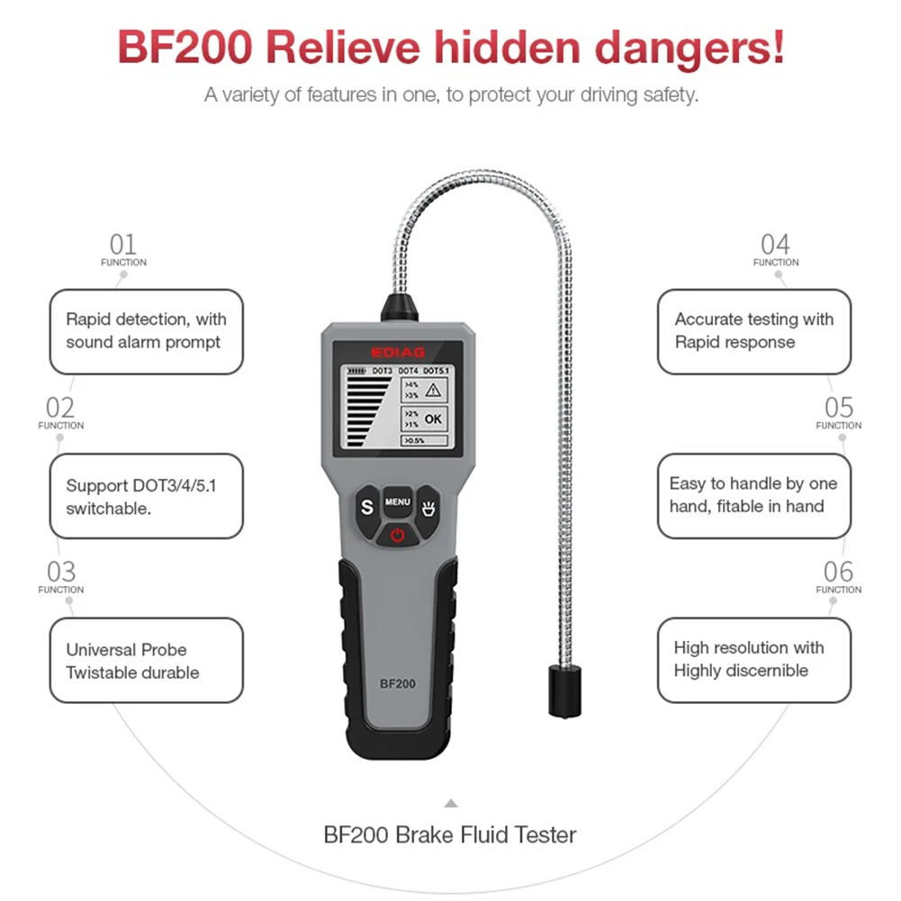 BF200 автомобильный тестер тормозной жидкости Цифровой дисплей Автомобильный DOT3 DOT4 DOT5.1 качество тормозной жидкости детектор содержания воды диагностические инструменты для мотоциклаХарактеристика:Высокоточный датчикЭкран с высоким разрешениемСменный дизайн батареиМногофазный тест жидкостиСпецификация:Модель: BF200Наименование: тестер тормозной жидкостиМатериал: АБС-пластикРазмеры: 6,14x2,17x0,94 дюймовВес: около 150 гТемпература: -10C - 50 ℃Батарея: 2 батарейки AAAA (не входят в комплект)Диапазон испытаний: DOT3, DOT4, DOT5.1Цвет: серый, черныйОпишите:1. Что такое Тормозная жидкость?Тормозная жидкость-это гидравлическое масло, используемое в гидравлических тормозах и гидравлических сцеплениях.Используется в автомобилях, мотоциклах, грузовиках-светильник и некоторых велосипедах.2. Принять меры предосторожности и двигаться с душевным спокойствием.После 1 года использования содержание воды в тормозной жидкости достигнет более высокого уровня. Когда содержание воды в тормозной жидкости достигает определенного уровня, тормозная сила будет ослаблена и расстояние торможения будет увеличено.BF200 детектор тормозной жидкости: BF200-это ручной детектор транспортного средства, который определяет, должен ли тормозной масляный бак быть заменен путем обнаружения влаги в тормозной жидкости. Его можно использовать для обнаружения тормозного масла DOT3, DOT4, DOT5.1, и пользователи могут использовать его в соответствии с их собственными потребностями обнаружения.Быстрое обнаружение, звуковая сигнализация.Поддержка переключения DOT3/4/5.1.Универсальный зонд, растягивающийся и прочный.Точное тестирование с быстрой реакцией.Легко Работать одной рукой.Высокое разрешение и высокое признание.Использование современных датчиков высокого качества, высокая чувствительность, быстрая реакция и простота в использовании.Когда обнаруживается, что содержание воды в тормозной жидкости превышает лимит, звуковой сигнал сообщит о замене тормозной жидкости.ЖК-дисплей отображает результаты теста и сообщает вам качество тормозной жидкости.Даже в темную ночь, также могут отображать четкие результаты теста.Примечание:В связи с различиями мониторов и эффектами освещения реальный цвет товара может немного отличаться от цвета на фотографиях. Спасибо!Возможны отклонения в 1-2 см вследствие измерений вручную.