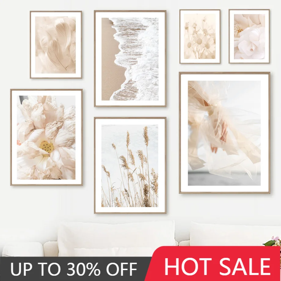 Бежевая пляжная волна тростник трава цветок перо пальмовый лист Художественная печать на холсте картина постер в скандинавском стиле украшение комнаты подарок