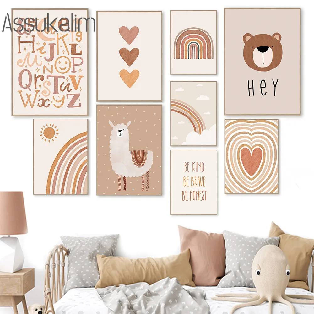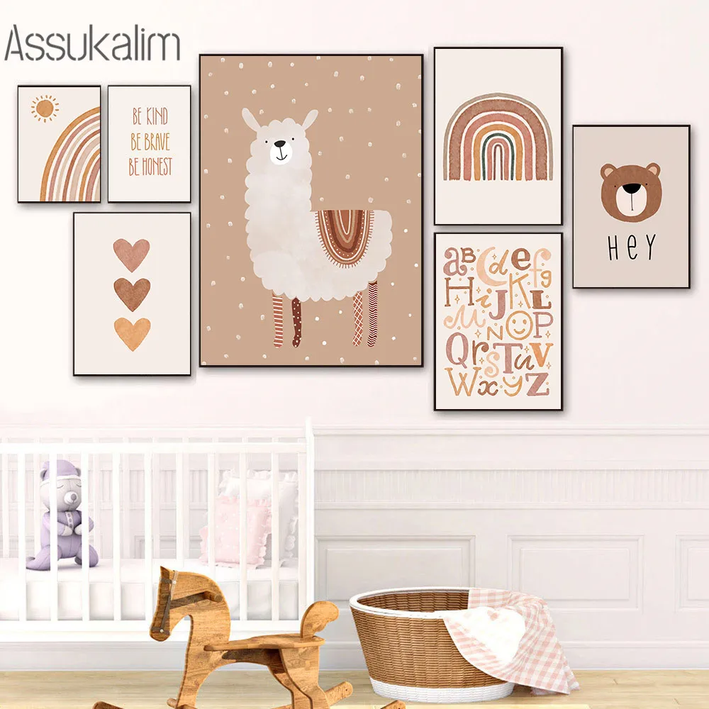 Картина на холсте медведь Альпака, Постер в стиле бохо с радугой, настенные картины с алфавитом, скандинавские постеры и принты, украшение детской комнаты