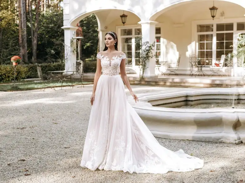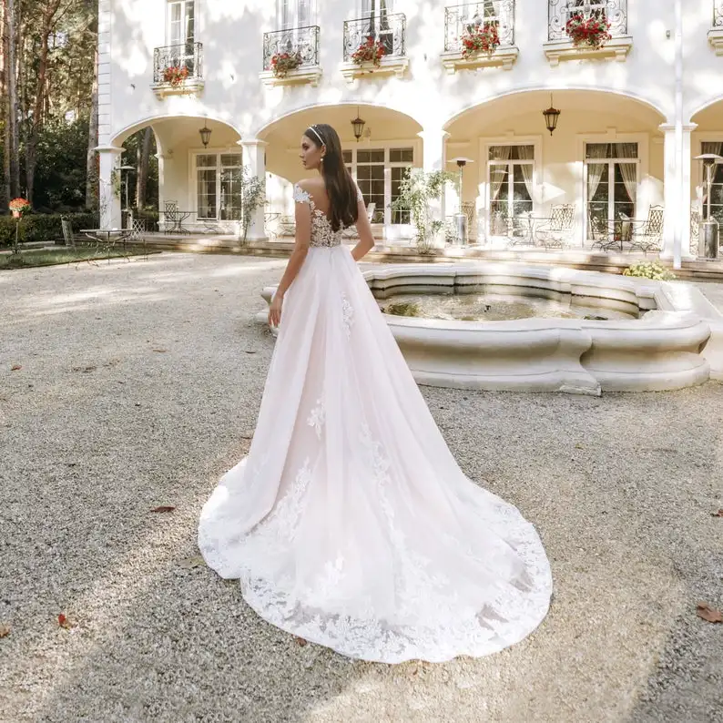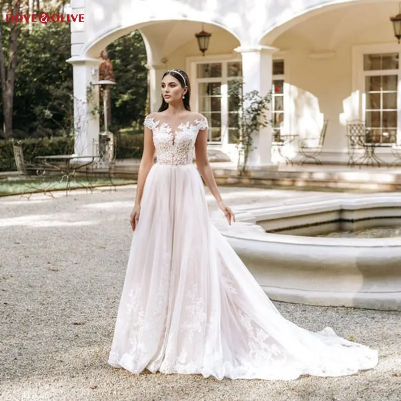 Богемное свадебное платье Бохо цвета слоновой кости кружевная персиковая Тюлевая юбка со шлейфом Современные Простые сексуальные открытые иллюзионные пуговицы пляжные платья для невесты
