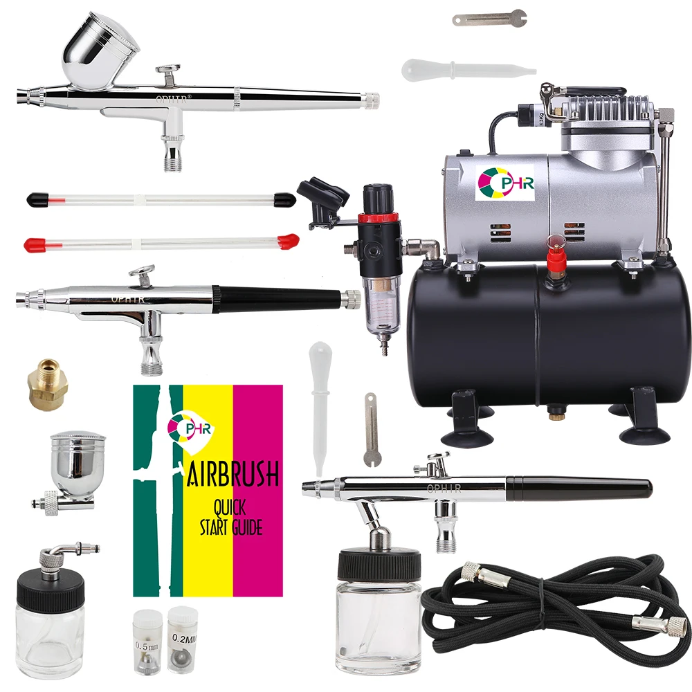 1x одноцилиндровый поршневой компрессор с воздушным баком3x набор аэрографов2x1,8 м воздушный шланг1 воздушный фильтр1x Мини-держатель для аэрографа4x руководство