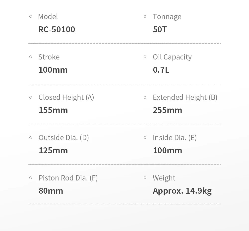 Модель: RC-50100Название продукта: гидравлический домкрат длинного типаТоннаж: 50 TХод: 100 ммМасло объем накопителя: 0,7 лВысота корпуса: 155 ммВысота домкрата: 255 ммВнешний диаметр: 125 ммВнутренний диаметр: 100 ммДиаметр поршня: 80 ммВес: 14,9 кгШирокий спектр применения: может быть применен в различных средах.Этот гидравлический домкрат часто используется в: электроэнергетике, химической промышленности, стали, машиностроении, промышленности и т. Д.