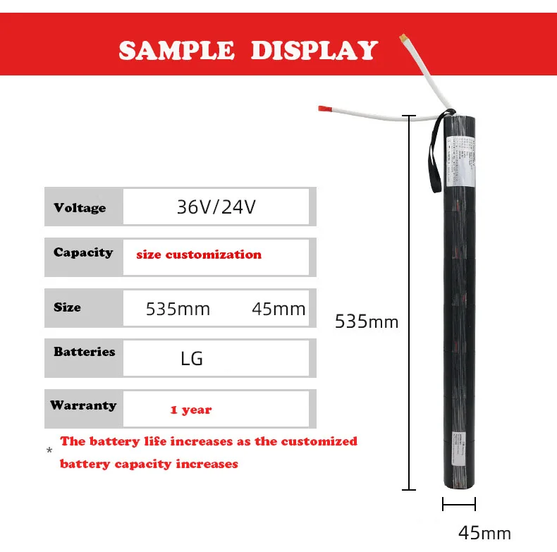 Название продукта: электрический скутер литиевая батареяНоминальное напряжение: 24 ВНоминальная мощность: 4,4/6,6/8,8/10.4ah.Номинальный рабочий ток: 10AМаксимальный непрерывный ток: 15аНапряжение зарядки: 29,4 вЗащита от перегрузки напряжение: 19 вСтандартный зарядный ток: 2AМаксимальный ток зарядки: 15аТок защиты от перегрузки по току: 85AРазмер: 550*45 мм, размер может быть измененРабочая температура °C: -20 ~ 60 °CТемпература хранения °C: -20 ~ 35 °CТемпература зарядки °C: 0 ~ 45 °CПрименимые виды продукции: электрические скутеры, велосипеды и т. Д.1 * применимый двигатель-это максимальная мощность двигателя, которая применима. В этом диапазоне мощности производительность батареи лучше, и срок службы больше.2 * Непрерывный пробег измеряет данные, специфические для различных продуктов, мощности двигателя, эффективности, окружающей среды, дорожных условий, нагрузки, тестовые данные будут отличаться.