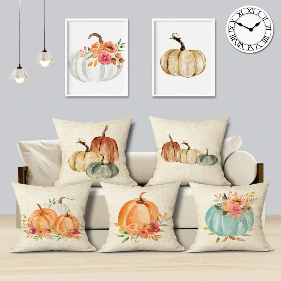 Наволочка льняная с рисунком "Урожай тыкв", осень Подушка с изображением тыквы