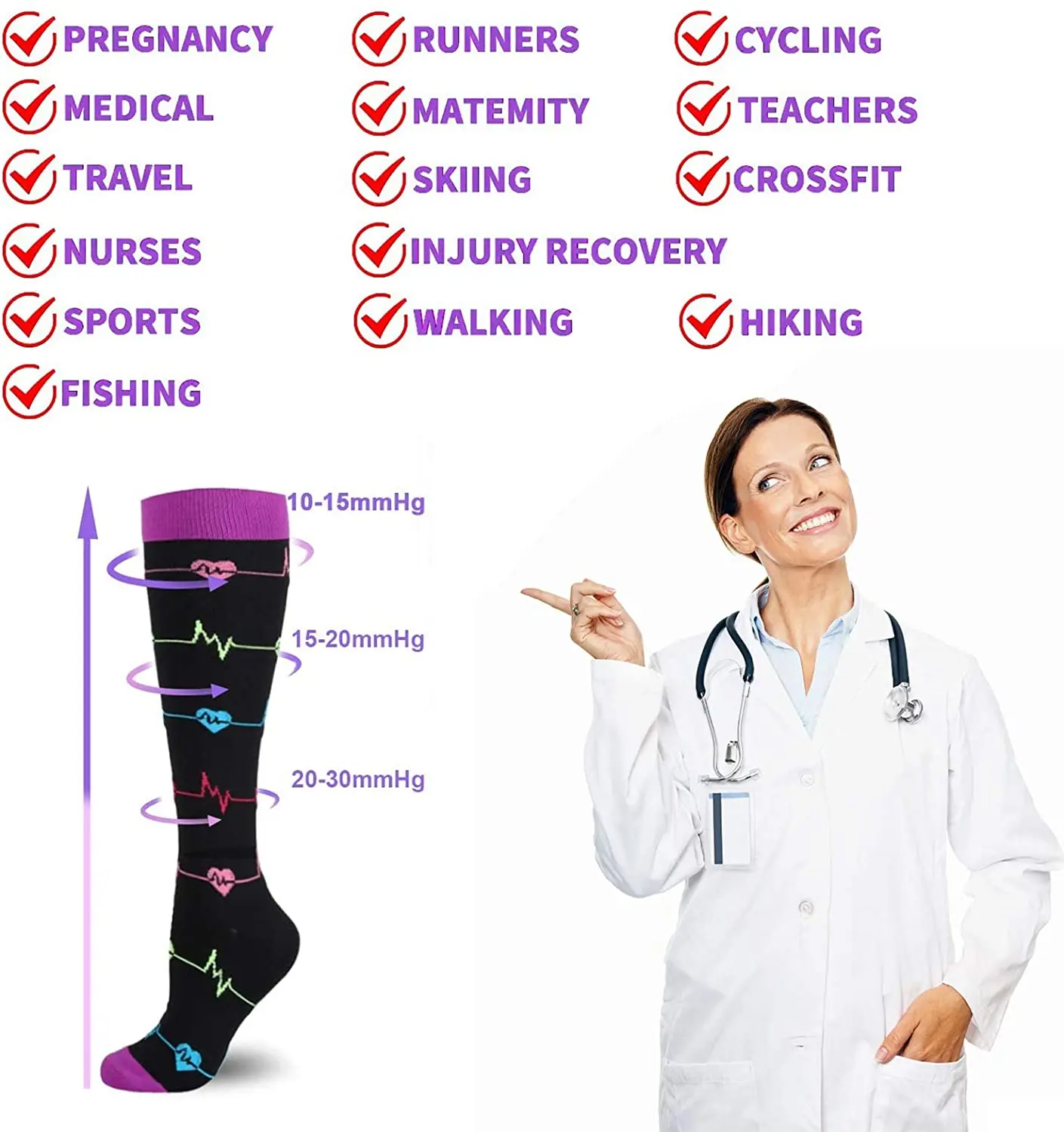 Удобные гольфы из материалаНаши компрессионные носки по колено изготовлены из нейлона с 40% до 85%, обеспечивают растягивание на 360 градусов для большей гибкости и долговечности. Дышащая высококачественная ткань обеспечивает оптимальную температуру. Идеально подходит для тех, кто сидит в течение длительного периода во время путешествия или на работе.Экономичный дизайн компрессионных носковНаши компрессионные носки плотно прилегают от носка к ноге, подпитывают вашу кожу. Они применяются для интеграции комфортной дышащей и быстросохнущей ткани, уменьшают мышечную болезненность, тем самым ощущая непосредственный комфорт. Мы утолщили область ткани лодыжки, более компактное сжатое переплетение, уменьшаем мышечную вибрацию и усталость, чтобы предотвратить растяжение лодыжки. Амортизация между пальцами, которая является бесшовной, расширяющейся и утолщенной. Используйте его каждый день, ночь или оба.20-30mmHg сжатияЛюбой человек может носить компрессионные чулки, если вы выберете уровень давления, который соответствует вашим потребностям. Хорошее правило большого пальца при выборе уровней сжатия носков для отдыха и отдыха заключается в снижении уровня сжатия в диапазоне 20-30 мм рт. Ст. Обычно подходит для обеспечения комфорта при ежедневном отдыхе и при занятиях спортом.Модный и красочный стильУ нас есть широкий выбор забавных цветов и уникальный дизайн узора! Они добавят оттенок к вашей обычной жизни. Быть модным и уникальным с нашими продуктами!Лучшие подарки идеяОтличный подарок для бегунов, баскетболистов, бегунов, спортсменов, спортивных соревнований, перекрестных тренировок, тренировок в тренажерном зале, пеших прогулок, тенниса, велоспорта, офисных работников, путешественников с самолетами, И на ногах весь день.