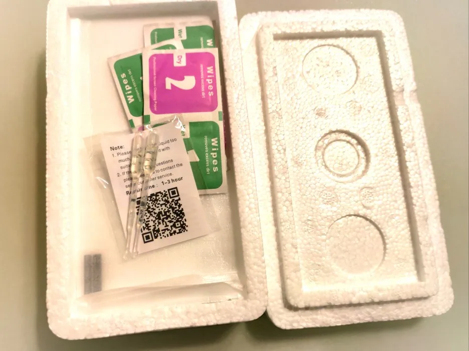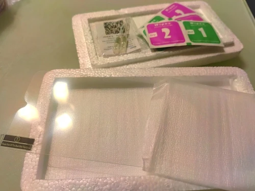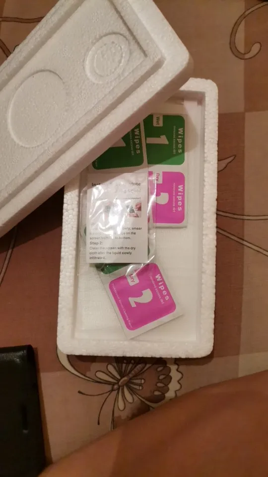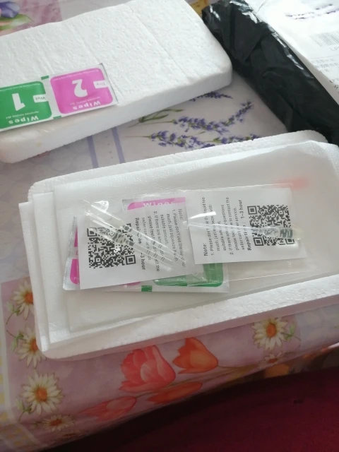 Пришло за 2 недели, скомпоновали 2 посылки в одну, вместе с чехлом. 3 стекла и жидкость для заливки между стеклом и экраном по краю экрана, чтобы не было белой полосы, где стекло не приклеилось.