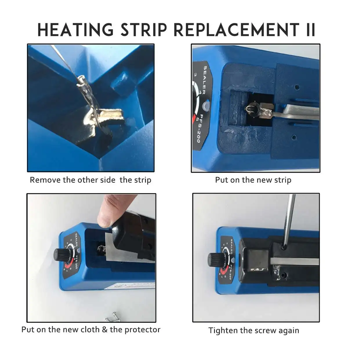 Нагревательная лента и высокотемпературная ткань необходимы для уплотнительной машины. Продукт может быть состарен после длительного использования. Пожалуйста, периодически проверяйте и проверяйте замену на запасную нагревательную ленту, если она сломана.