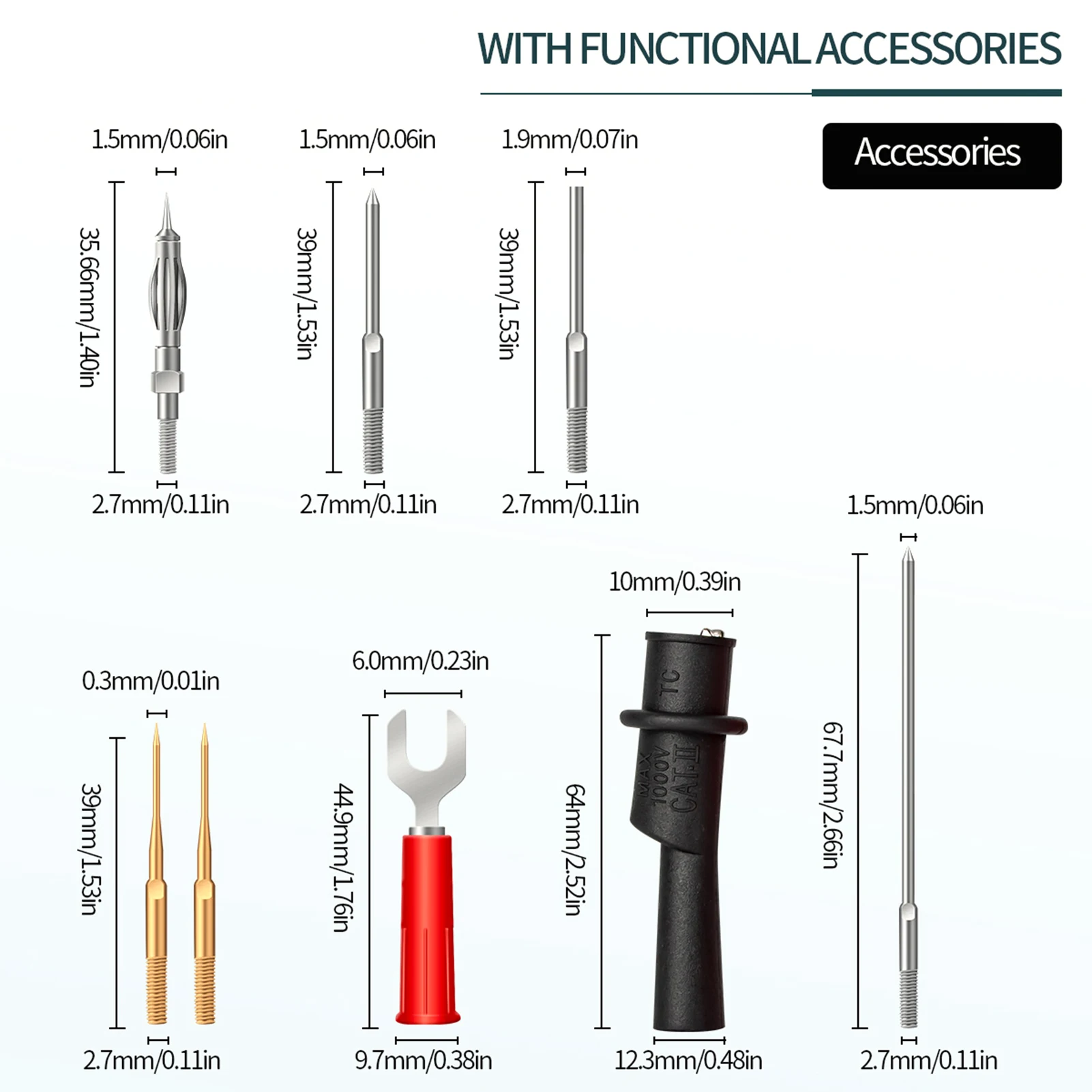 A3008-это Карманный смарт-мультиметр типа 3 5/6 цифр, с истинным RMS. Он автоматически определяет напряжение постоянного тока/напряжение переменного тока/сопротивление и измерение, без необходимости поворачивать циферблат для переключения, прост в эксплуатации. Кроме того, он оснащен стабильной производительностью, высокой точностью, автоматическим выключением после 5 мин неиспользования для экономии энергии, емкостного/диодного/более теста, защиты от перегрузки, испытания на непрерывность, бесконтактное измерение напряжения (NCV), измерение нулевой линии, измерение последовательности фаз и т. д. Идеальный инструмент для профессионального, фабричного, школьного, энтузиаста или семейного использования. Особенности: Универсальный мультиметр ручки:Этот мультиметр оснащен испытанием напряжения/сопротивления/емкости/диода/частоты/температуры, непрерывности, нулевой линии и бесконтактной фазы обнаружения последовательности и т. Д. Быстрая реакция и высокая точность:ANENG A3008, 6000 отсчетов Цифровой мультиметр типа ручки, имеет частоту дискретизации 3 раза в секунду и высокую точность измерения. Простота в эксплуатации:Он имеет ЖК-экран, легко читает измеренные значения, фонарик доступен для темноты, функция хранения данных удобно запрашивать данные, сигнал тревоги при использовании. Прочный материал и портативный размер:Счетчик, изготовленный из выбранных электронных компонентов и прочного пластикового корпуса, имеет вес и легкий в переноске Карманный светильник, удобный в использовании. Широкое применение:Цифровой мультиметр-удобный инструмент и помощник, для тестирования, диагностики и решения различных автомобильных и повседневных бытовых электрических проблем безопасно и точно. Несколько аксессуаров:1 × u-образная вставка, 1 × крокодил, 2 × дополнительный наконечник, 1 × никелированная медная игла, 1 × коническая игла, 1 × удлиненная никелированная медная игла, 1 × наконечник банана в комплекте. Диапазон измерения и точность: Напряжение постоянного тока: DC6V/DC60V/DC600V ±(0.5% + 4); DC1000V ±(0.8% + 10) Напряжение переменного тока: AC6V/AC60V/AC600V ±(0.5% + 4); AC700V ±(0.8% + 10) Сопротивление: 600Ω ±(0.8% + 5); 6k Ω/60k Ω/600k Ω/6MΩ ±(0.8% + 3); 60MΩ ±(2.5% + 3) Постоянной ёмкости, универсальный конденсатор: 10nF/100нф/1 мкФ/10 мкФ/100 мкФ/1mF/10mF ±(3.5% + 20); 60mF ±(5% + 3) Температура: -20 ~ 50 ℃,±(1.0% + 5)<50 ℃; 0 ~ 122 ℉,±(0.75% + 5)<122 ℉ Характеристики: Бренд: ANENG Модель: A3008 Материал: АБС-пластик Материал тестовой линии: латунь/ПВХ Основной цвет: черный Экран: ЖК-дисплей Максимальный дисплей: 5999 (3 5/6) автоматический дисплей полярности Метод измерения: двойное интегральное преобразование A/D Время выборки: около 3 раз/секунду Индикация диапазона: «OL» отображается в самом высоком положении Тест напряжения постоянного тока: Да Проверка напряжения переменного тока: Да Тест на сопротивление: Да Тест на Емкость: Да Диодный Тест: Да Тест на непрерывность: Да Бесконтактная фазовая проверка последовательности: Да Цвет экрана: Да NCV: Да Нейтральный/Огнестойкий Тест: Да Полный символ единицы: Да Подсветка: Да Автоматическое выключение питания: Да Истинный RMS: Да Хранение данных: Да Температура (℃/℉): Да Гц: Да Фонарик: Да Рабочее состояние: 0 ~ 40 ℃ температура, <80% Относительная влажность Питание: 1*1,5 V элемент питания AAА (в комплект не входит) Длина тестового провода: 117,4 мм/4,62 дюйма Размер продукта: 170*24*21 мм/6,69*0,94 * 0.82in Вес продукта: около 50 