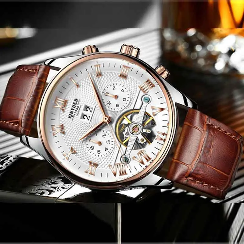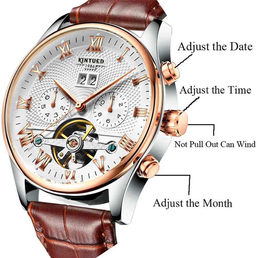 Мужские механические часы-скелетоны KINYUED с турбийоном, автоматические Классические наручные часы цвета розового золота с кожаным ремешком для мужчин, мужские часы