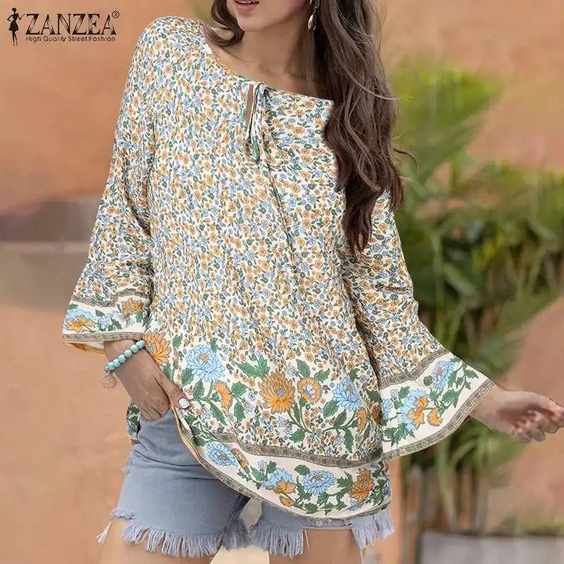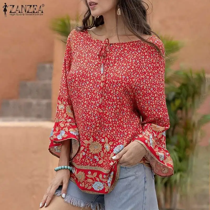 Женская Осенняя блузка с цветочным принтом, свободная, с длинным Расклешенным рукавом