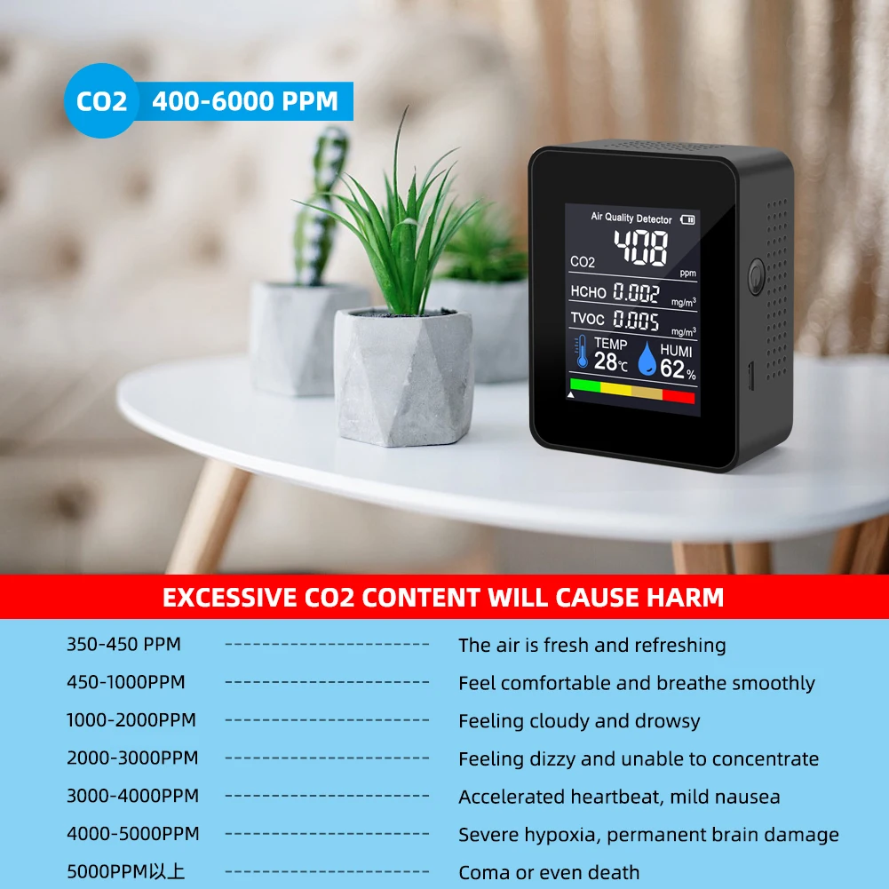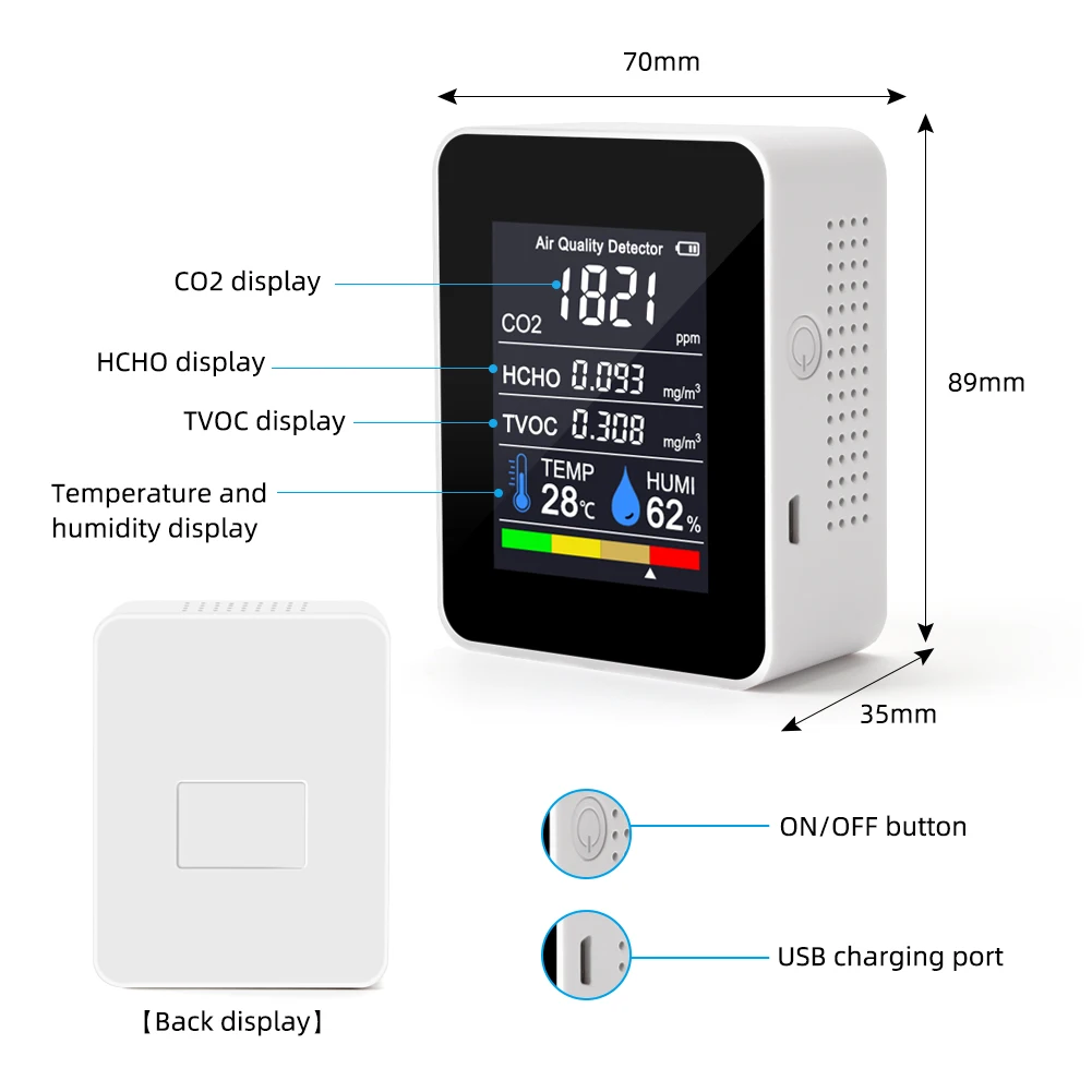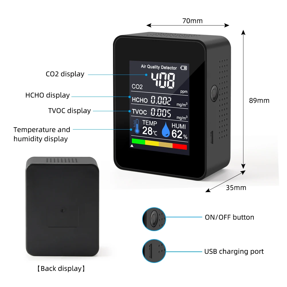 5, простота в эксплуатации: этот воздушный монитор прост в эксплуатации, который просто нажимает функциональную кнопку и один полный дизайн страницы позволяет каждому легко читать все показания в реальном времени одновременно. Размеры около 3,5*2,75*1,38 дюймов. Легко носить с собой умный монитор качества воздуха, который может помочь нам обнаружить дома, офисы, школы, отели, больницы, лаборатории и в любом месте с высоким уровнем углекислого газа и формальдегида.