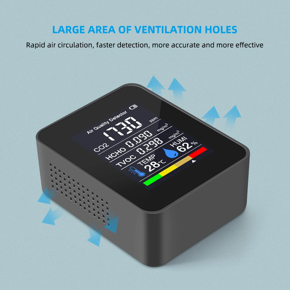 4. Четко знайте свой воздух: для всех необходимо знать качество воздуха в месте, где вы живете. Этот воздушный монитор имеет ЖК-цифровой цветной экран, большой и легко читаемый. Этот монитор воздуха будет предлагать цветной индикатор, чтобы показать общее качество окружающей среды, которое имеет хорошее (зеленый), мягкое загрязнение (желтый), средне загрязненное (коричневый), сильное загрязнение (красный) четыре класса. Вы можете напрямую узнать общее качество окружающей среды и узнать, какой газ в воздухе небезопасен, и принять соответствующие меры.
