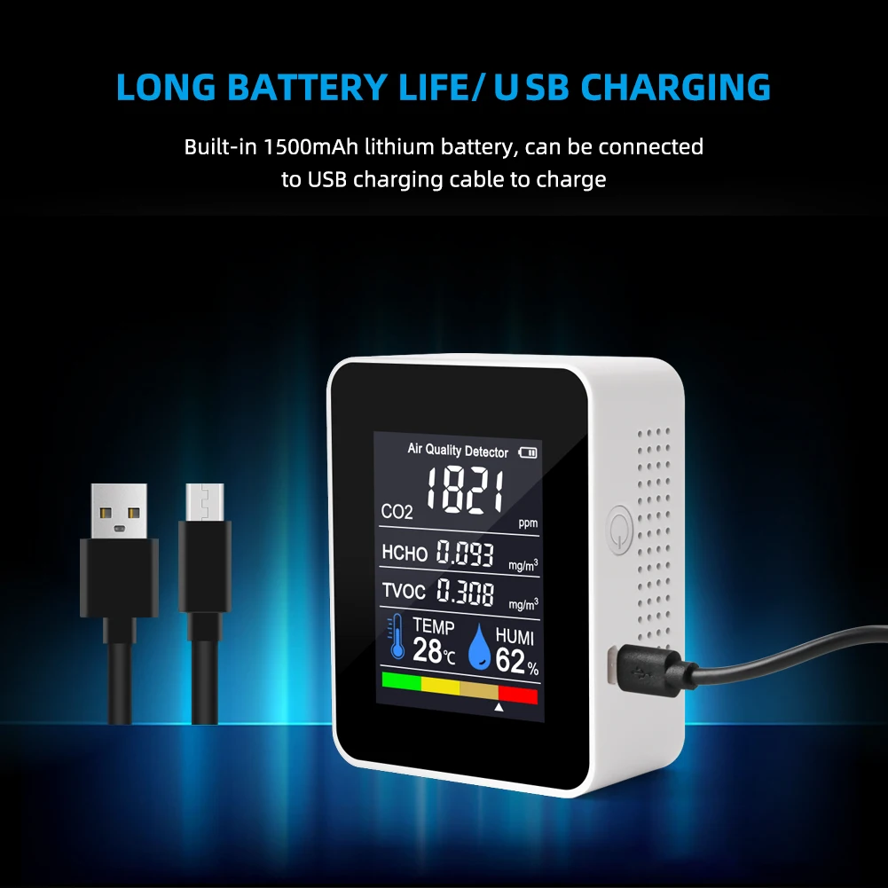 3. Перезаряжаемая батарея: тестер качества воздуха имеет перезаряжаемую литиевую батарею 1500mAn и упакован с usb-кабелем, который может работать до 8 часов. Вы можете заряжать монитор качества воздуха через блок питания, адаптер питания, компьютер, ПК, ноутбук. Встроенный чип обработки с низким энергопотреблением может работать с длительным непрерывным мониторингом качества воздуха. Это всегда заботится о вас и здоровье вашей семьи.