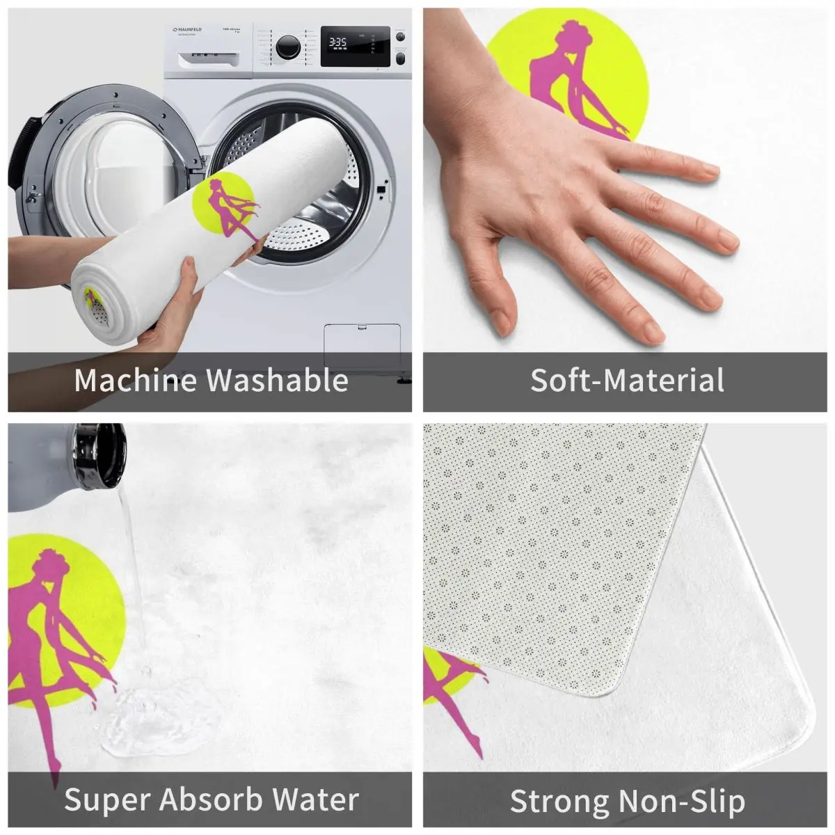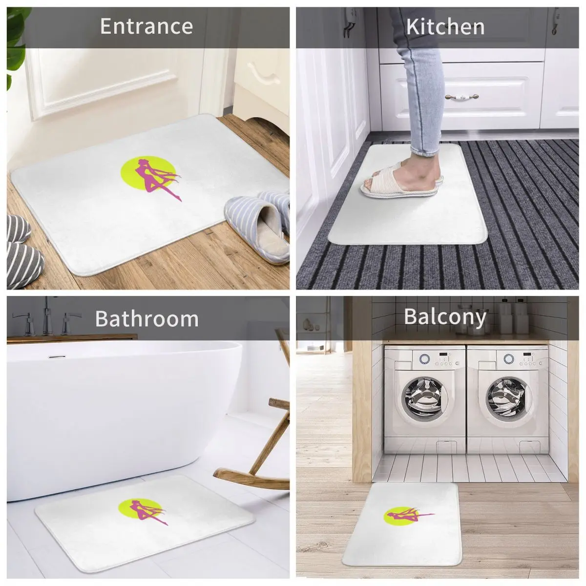 Можно использовать под столом и на кухне, гостиной, балкона, ванной комнаты, прихожей, ванной, спальни, прохода, входа, в помещении, на открытом воздухе, детской площадке, прикроватной зоне, татами, прачечной