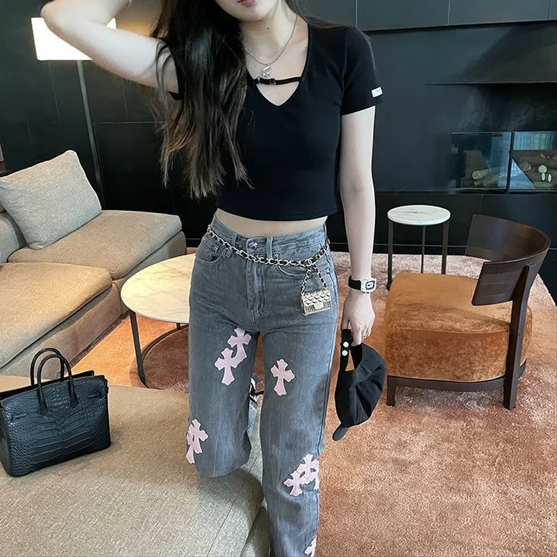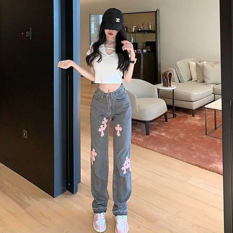 Модные новые кожаные розовые джинсы с перекрестными углами, Женские винтажные готические серые свободные прямые джинсы, осенняя джинсовая одежда для девушек в стиле хип-хоп