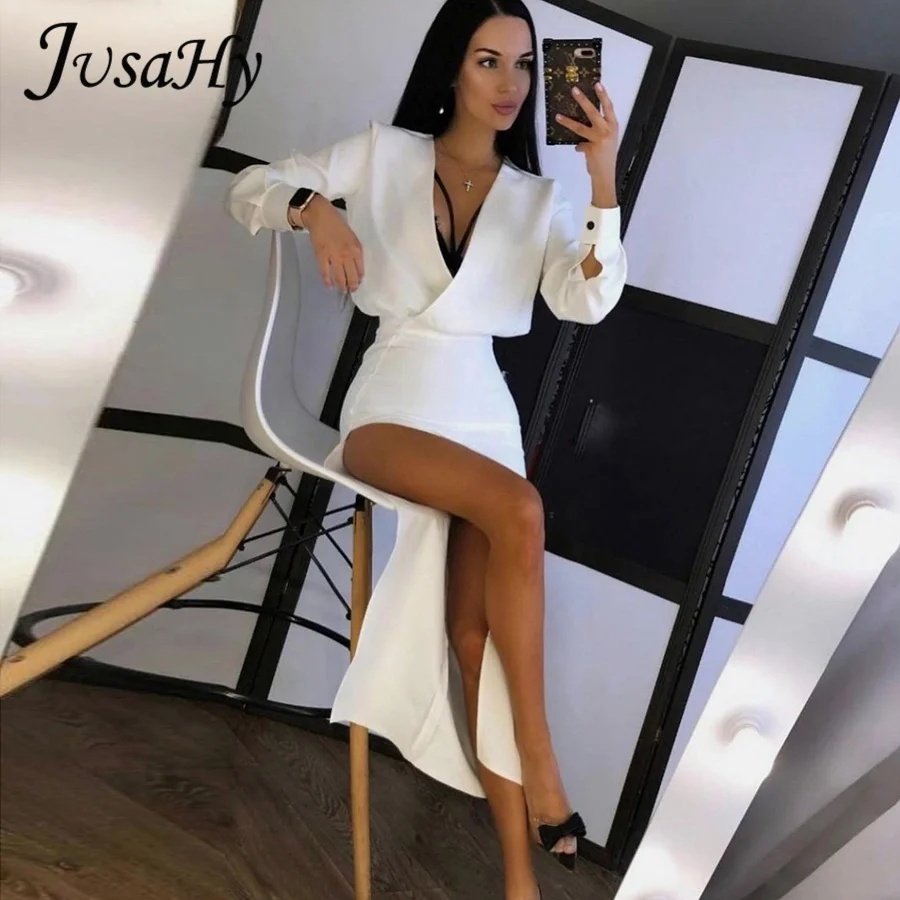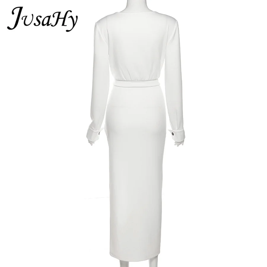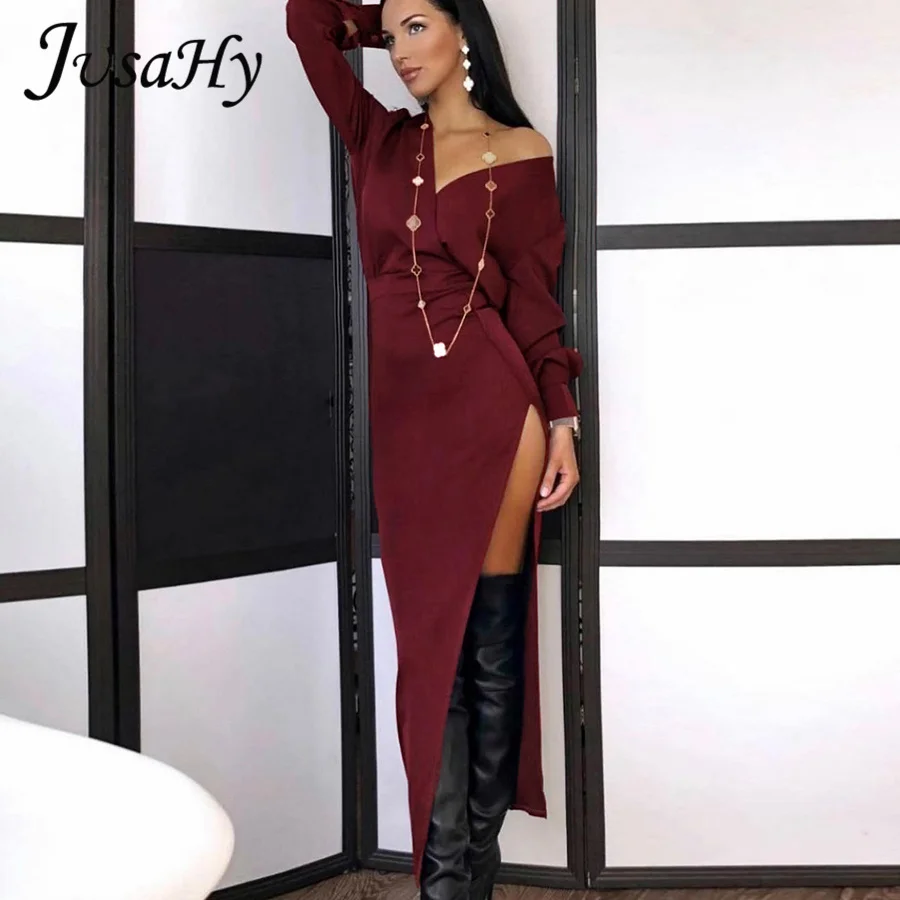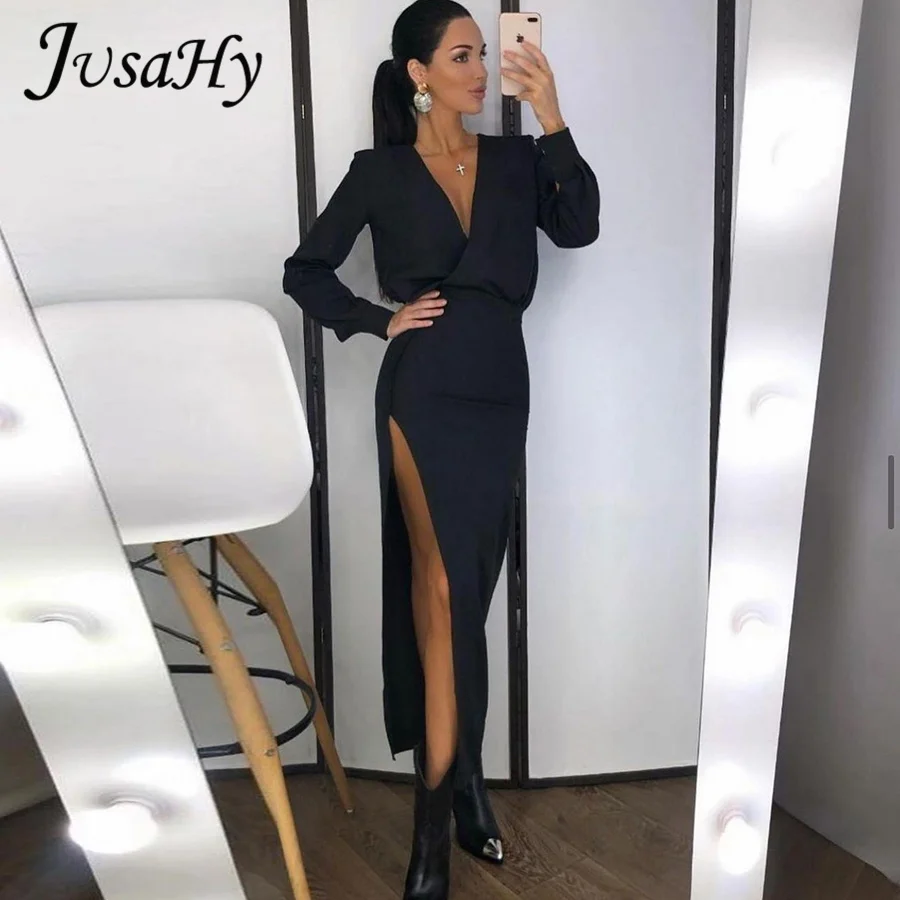 Элегантное однотонное платье-макси JuSaHy для женщин, модное приталенное платье с длинными рукавами и V-образным вырезом, с высоким разрезом сбоку, Повседневная Уличная одежда, женские платья