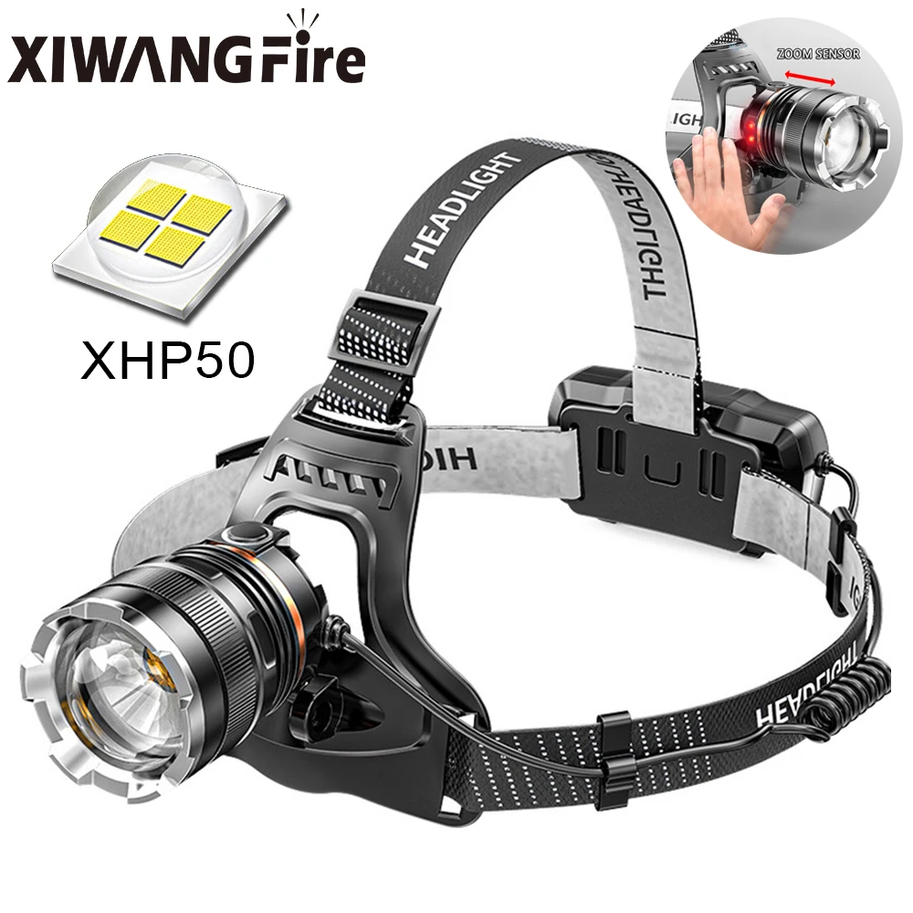 Налобный фонарь XHP50, мощный супер яркий уличный фсветильник рь с датчиком масштабирования, фонарь с зарядкой от USB, рыболовный фонарь