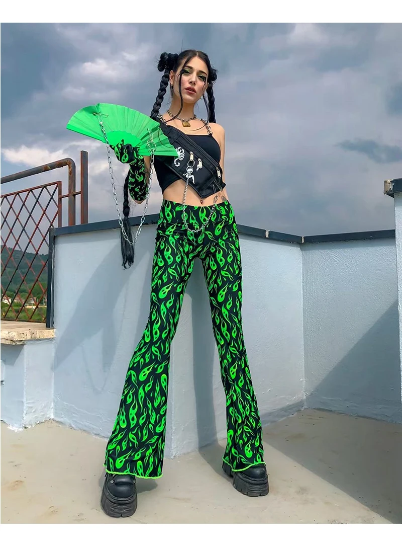 Зеленые блестящие женские расклешенные брюки с принтом, Y2k, этетический Готический стиль, новинка 2021, модные неоновые брюки полной длины для E-girl
