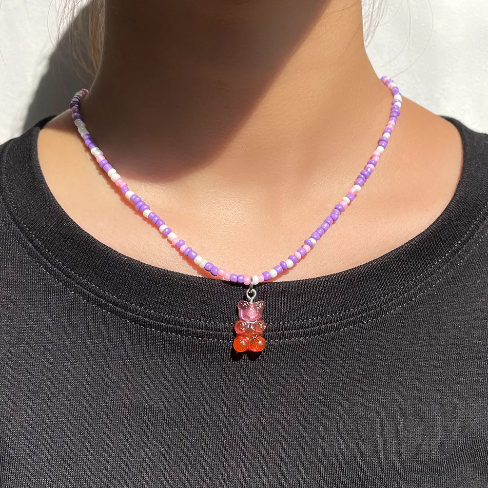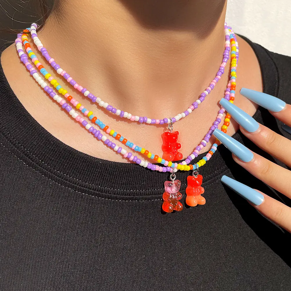 Новинка 2021, ожерелье из бисера радужного цвета с полимерным мишкой из жевательного бисера для женщин и девушек, цепочка из бисера ручной работы, чокер, ожерелье, корейские милые украшения