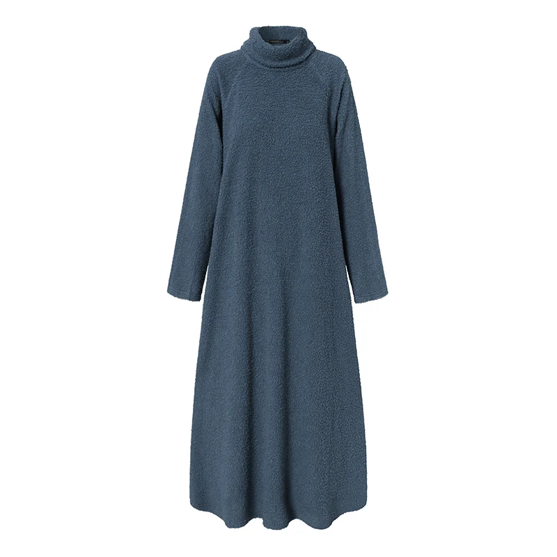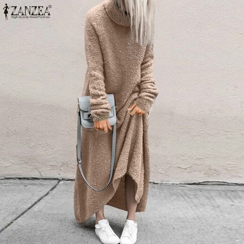 Модное плюшевое пушистое платье-свитшот ZANZEA, Осенний женский сарафан с высоким воротником и длинным рукавом, женское однотонное Свободное длинное платье