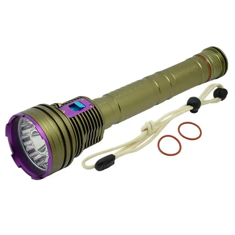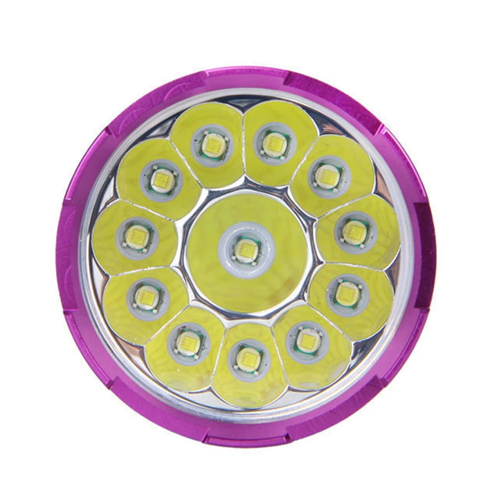 Этот фонарь использует 12x CREE XM-T6/L2 светодиодный, производя очень яркий светильник.Выход яркий может достигать более 21000 люменов (лм)Внутренняя проводка применяет высокоэффективный усилитель цепи, и может использовать батареи в большой степениКорпус этого фонарика изготовлен из авиационного алюминиевого сплава и имеет очень прочную конструкцию.Жесткая анодированная отделка; Анти-абразивный, не царапается, ударопрочный.Ультраглубокий Противоскользящий эффект trench structuresi отлично подходит для дайвингаВ этом фонарике используется текстурированный отражатель (а не гладкий отражатель). Луч из текстурированного отражателя более ровный, с более постепенным переходом между горячим пятном (центром пучка) и разливом (периферией пучка)