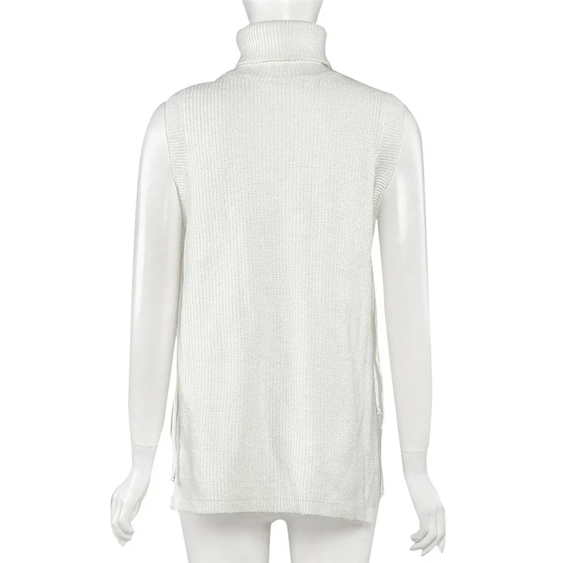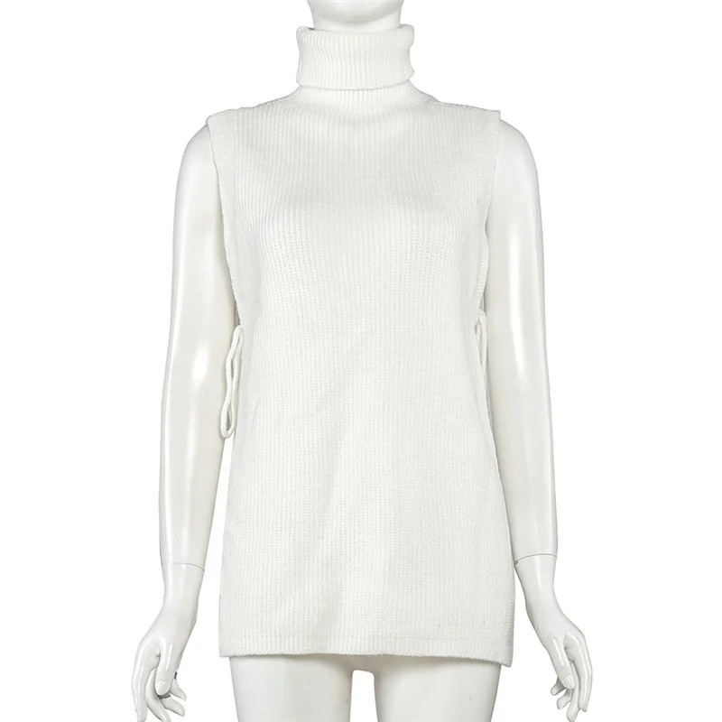 Осенний вязаный свитер, женские базовые вязаные топы без рукавов, пикантные пуловеры с высоким воротником и разрезом сбоку, со шнуровкой