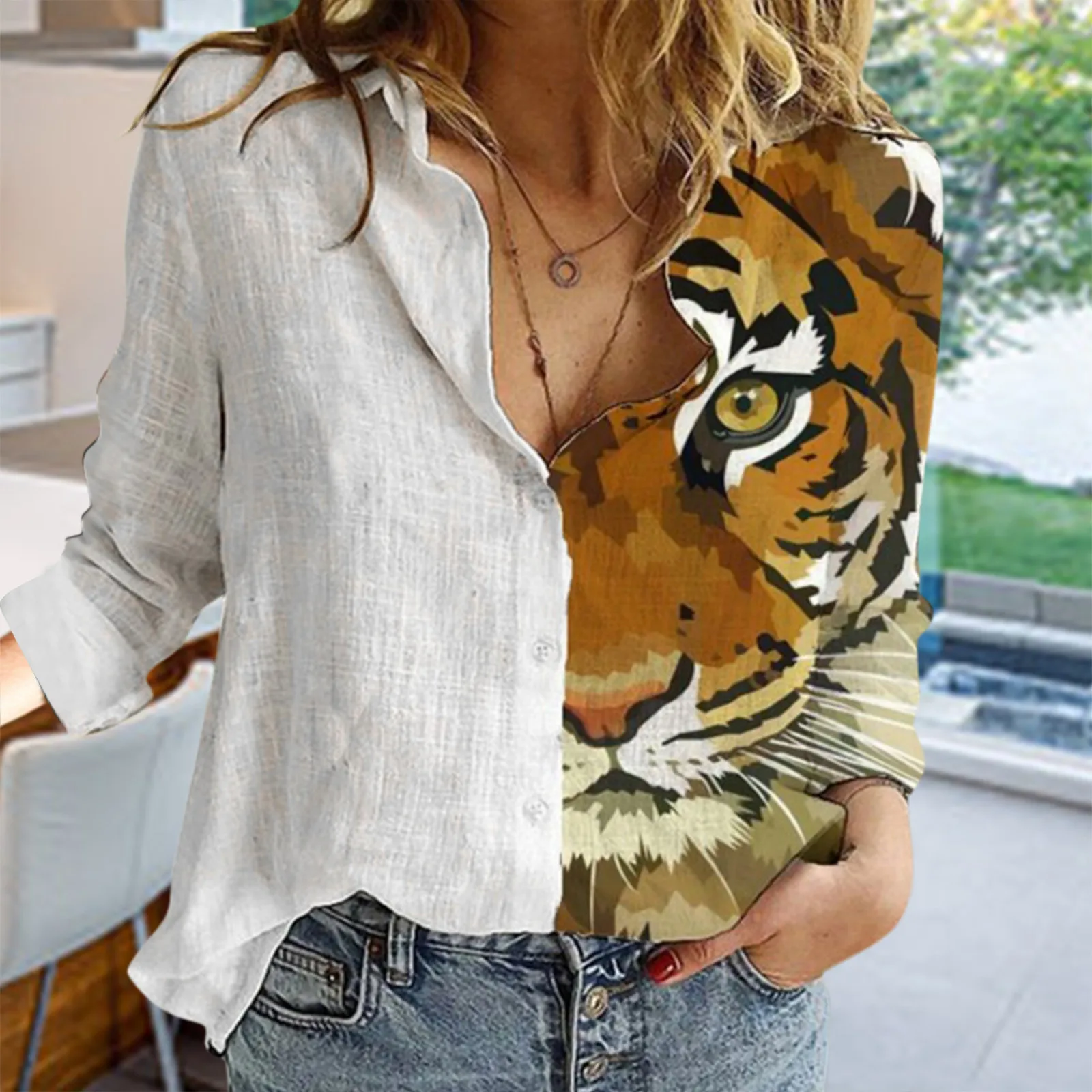 Блузка Женская Осенняя с принтом тигра, свободная Рубашка с отложным воротником, на пуговицах, с длинным рукавом, Офисная уличная одежда, топ для отдыха