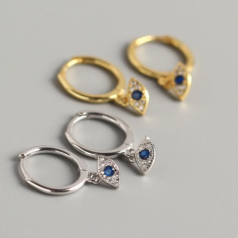 Серьги-кольца женские из серебра 925 пробы с голубыми глазами