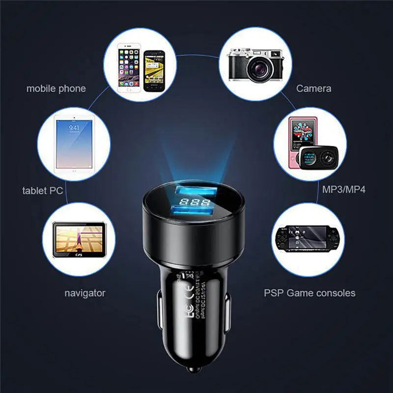 Автомобильное зарядное устройство с 2 USB-портами и ЖК-дисплеем, 12...
